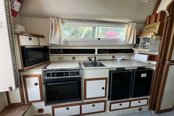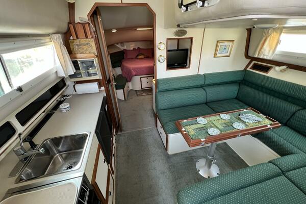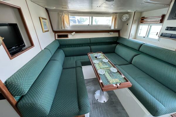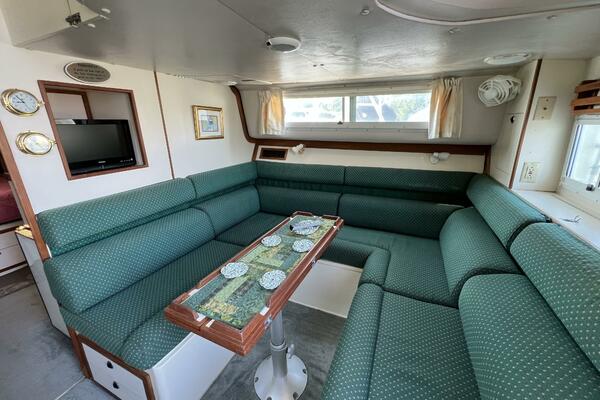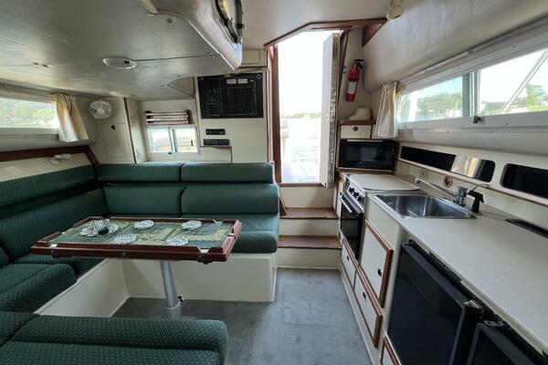 - The main salon is bright and airy, with plenty of side windows that provide excellent natural light and visibility. To starboard, you’ll find a comfortable U-shaped dinette, which easily converts into a King size berth, making this area ideal for both lounging and accommodating guests. She has a pedestal mounted table with leaves that fold out for maximum dining capacity. An abundant amount of storage is found under the seats of the dinette. Opposite to port is the large side galley with plenty of counter space and storage for food prep.