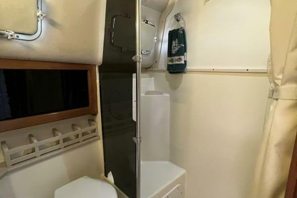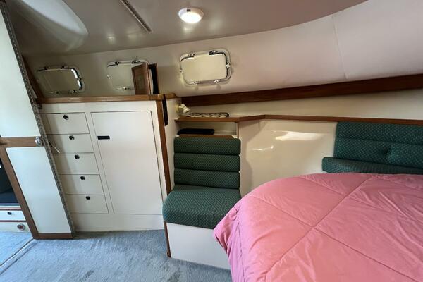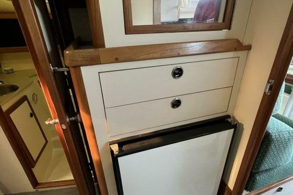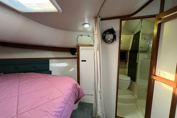 - Moving forward you enter the master stateroom. One will be surprised by all the space, storage and comfort. She has a centerline queen berth with seat to port and a step on either side for easy access to the berth. Aft to starboard is the large head compartment with separate shower stall. There is an abundance of drawers and hanging lockers for extended cruising, there is also a Freezer.