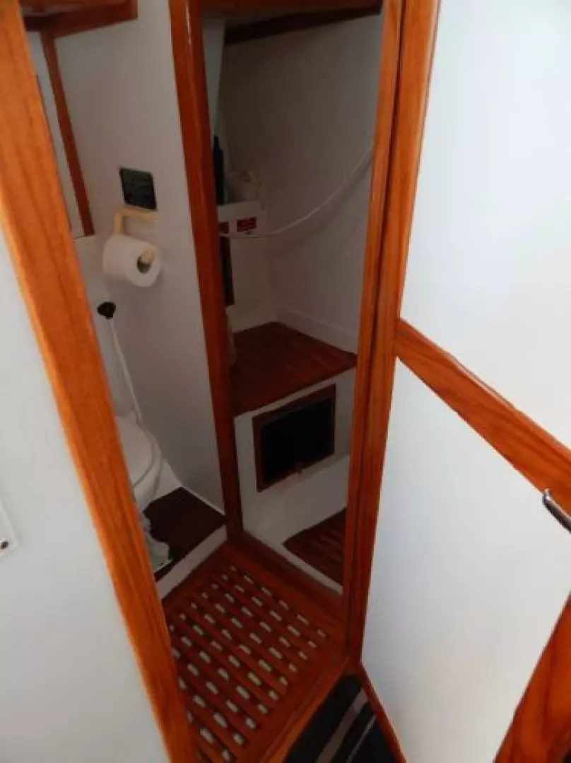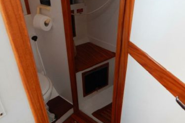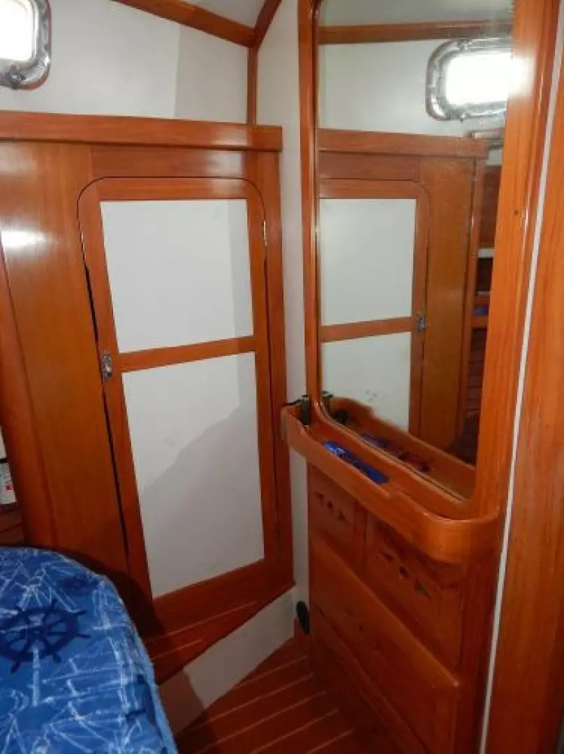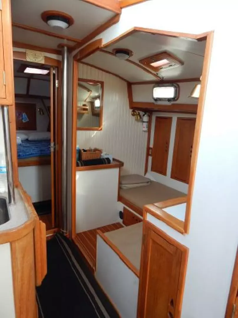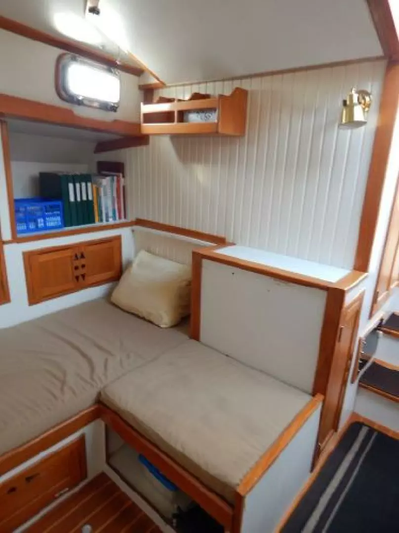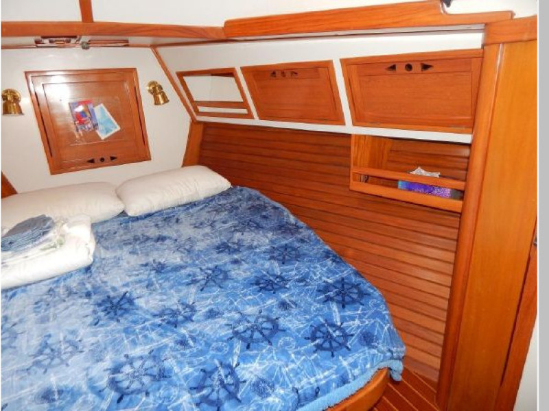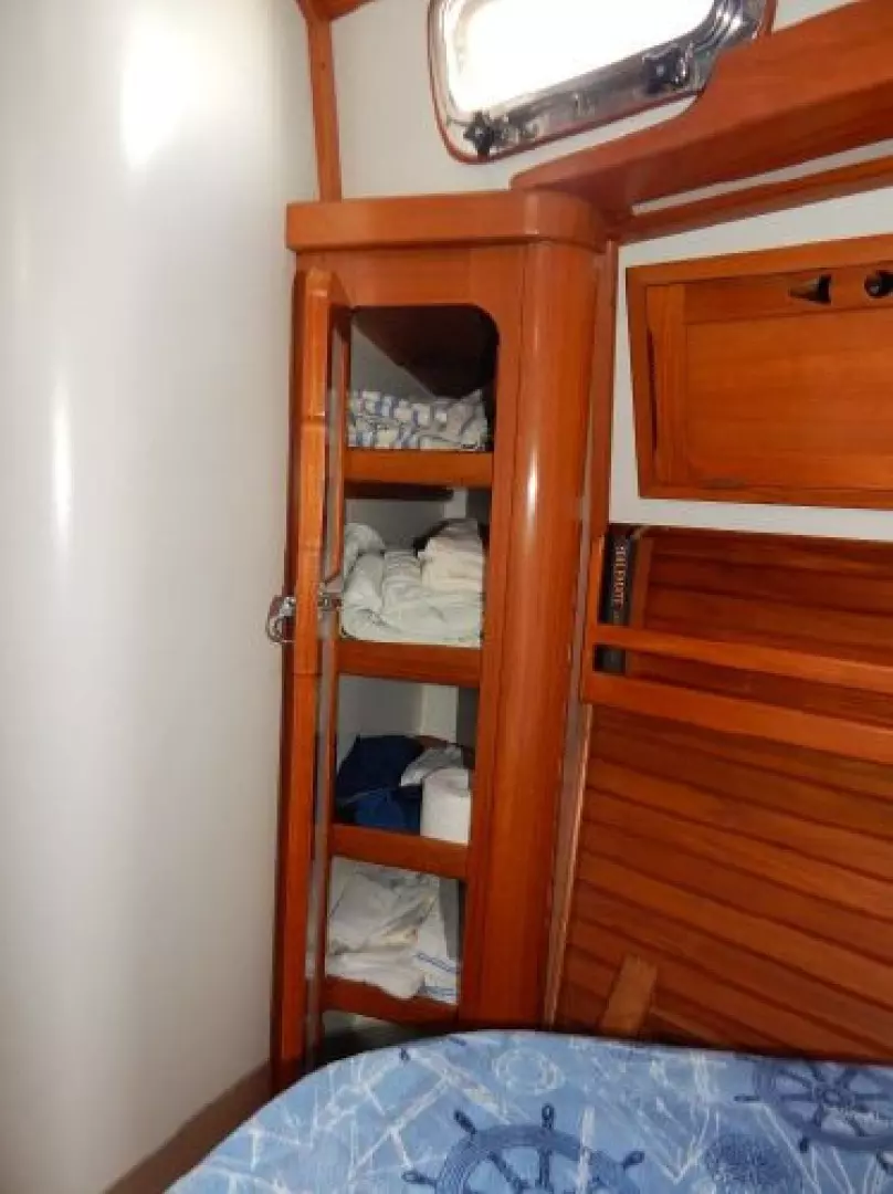 There is a second stateroom to starboard with a single berth, abundant storage in book cases, hanging lockers and under berth lockers.