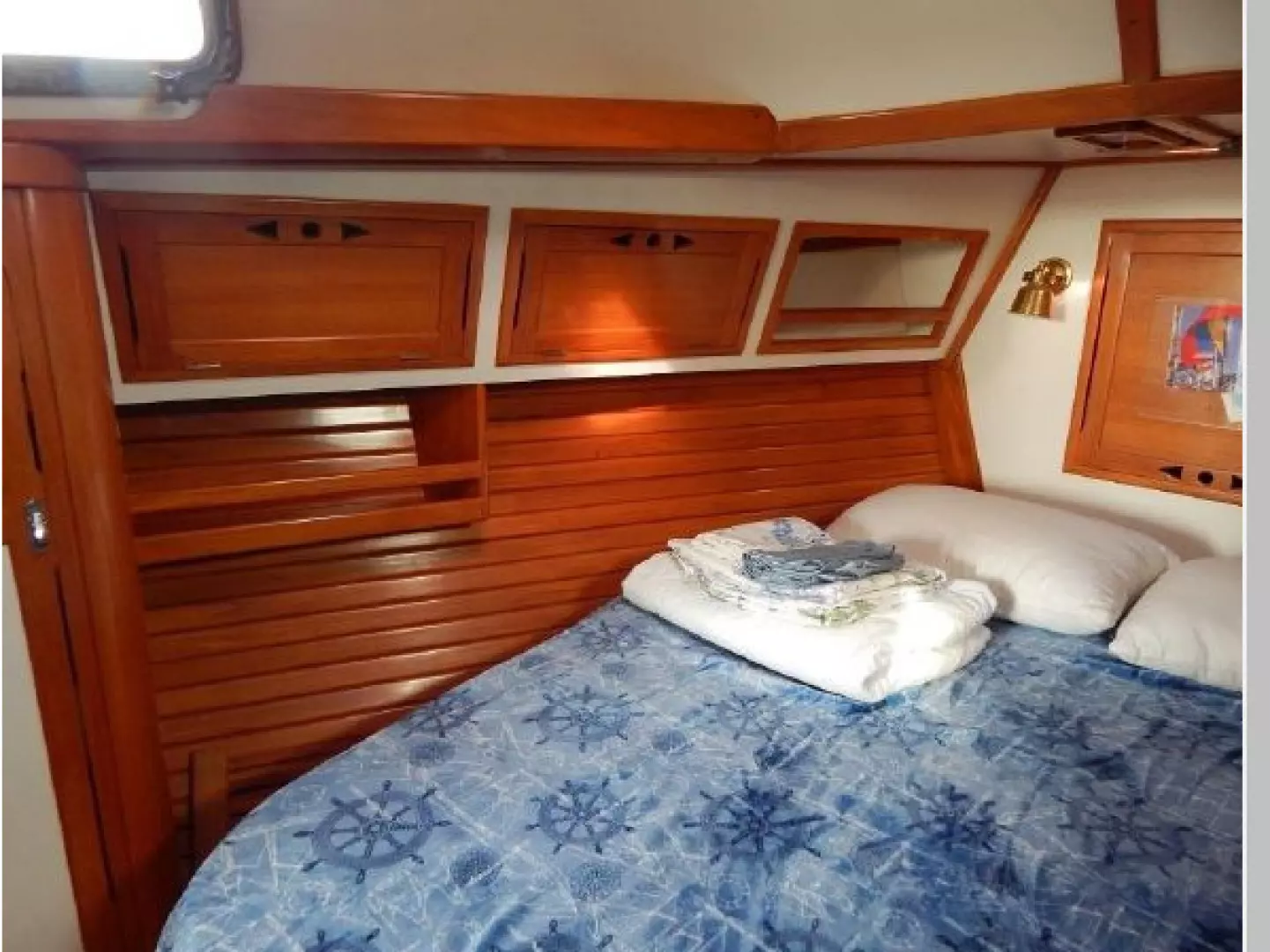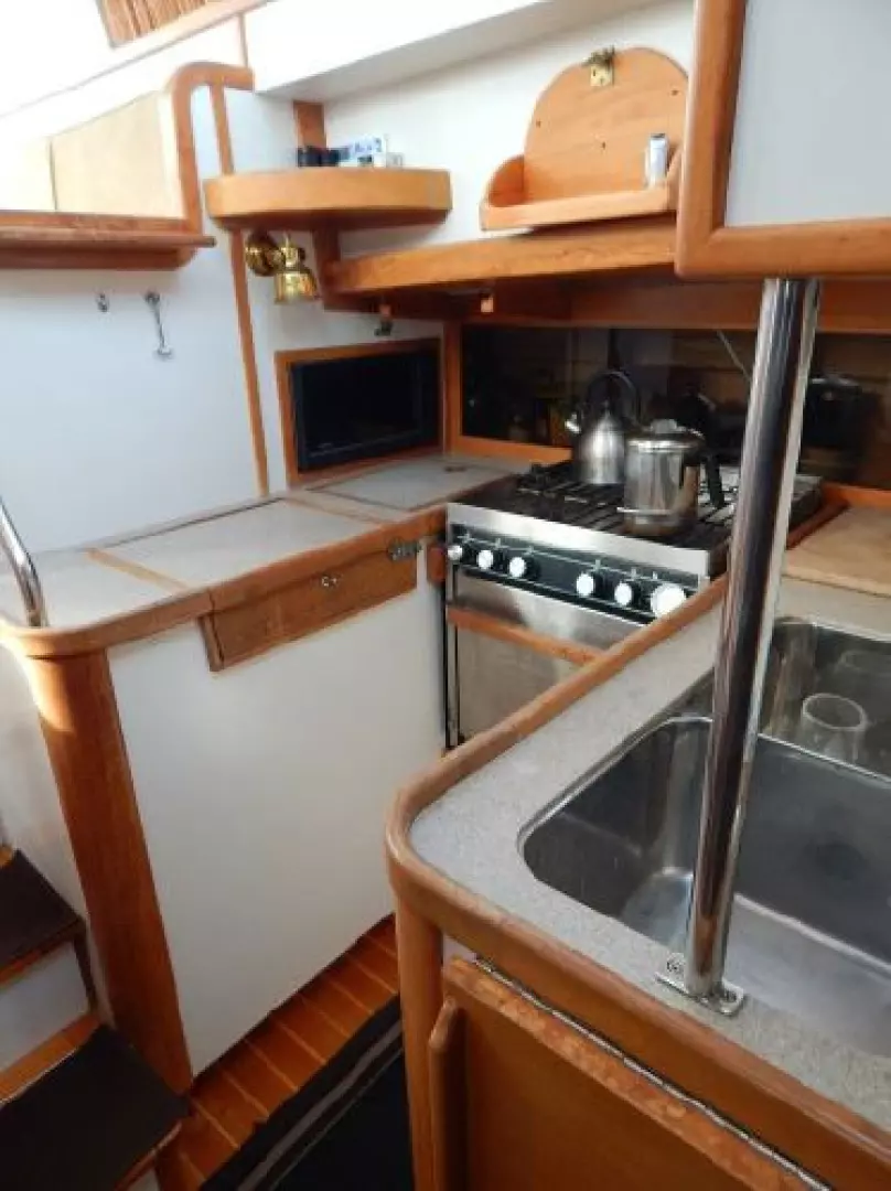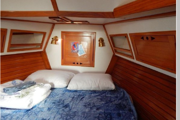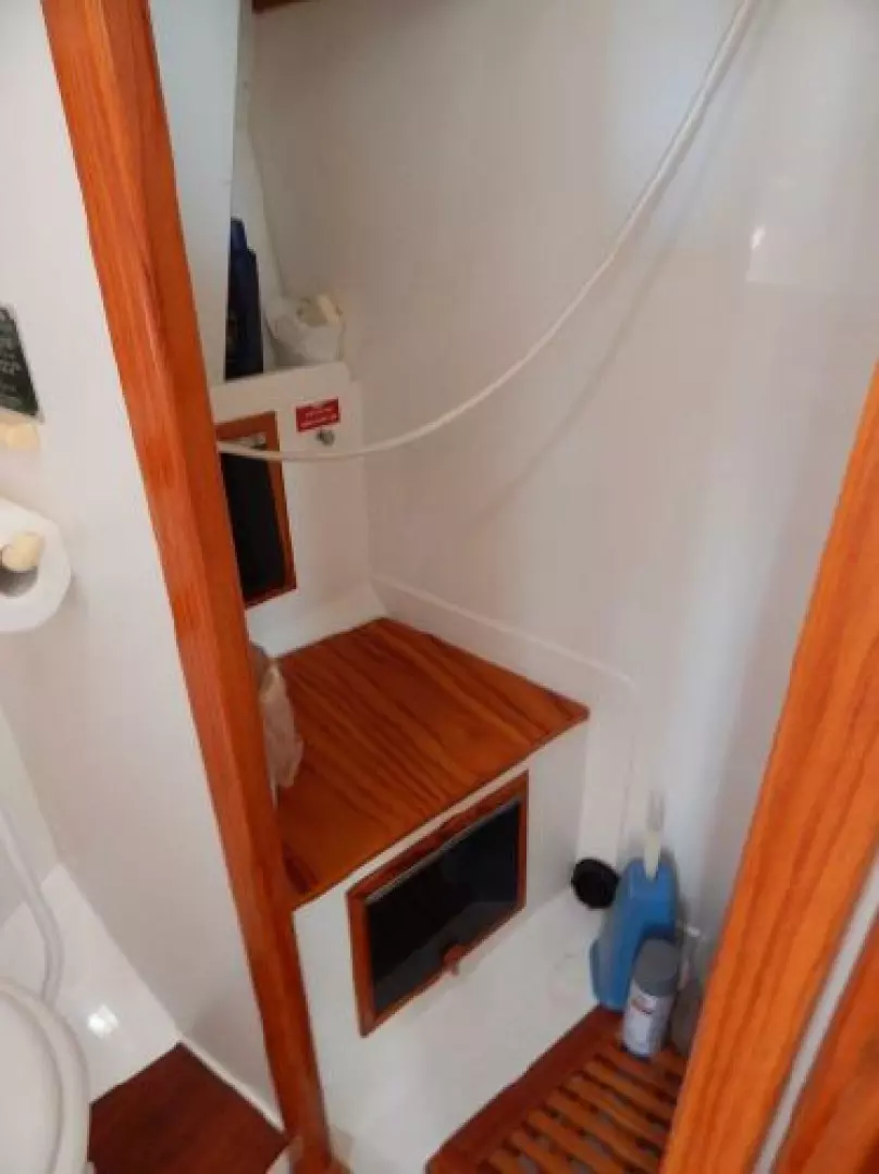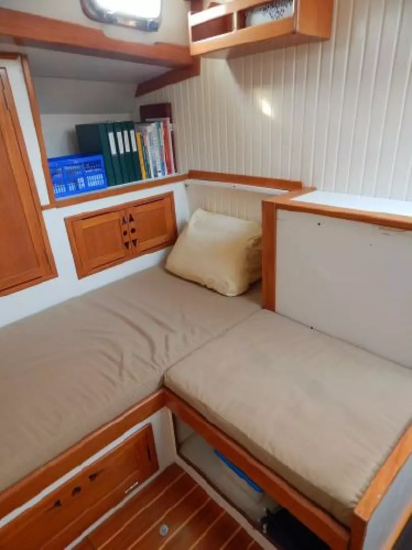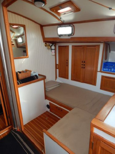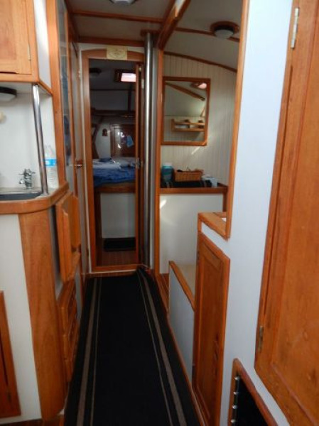 There is a second stateroom to starboard with a single berth, abundant storage in book cases, hanging lockers and under berth lockers.