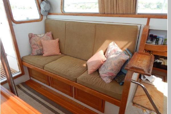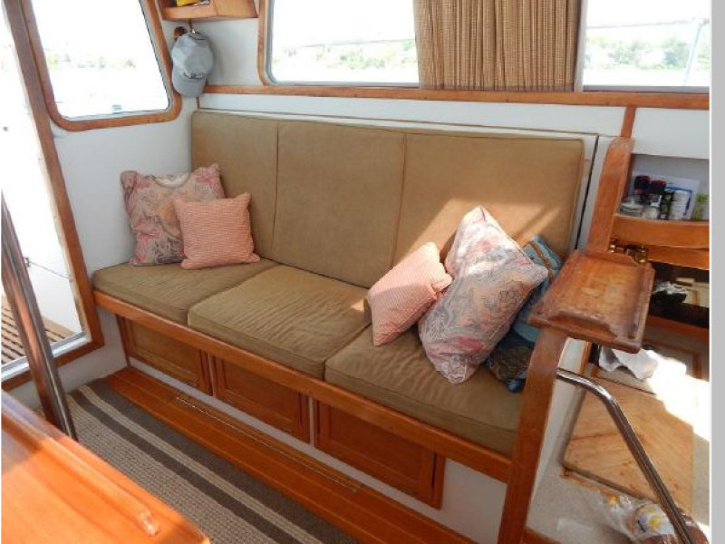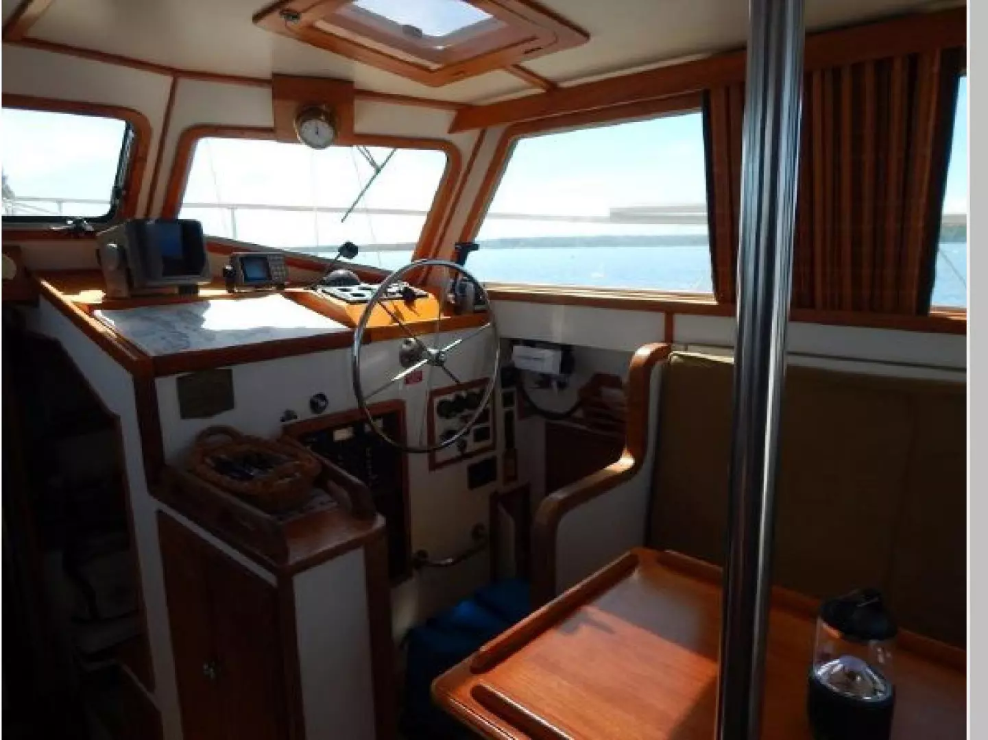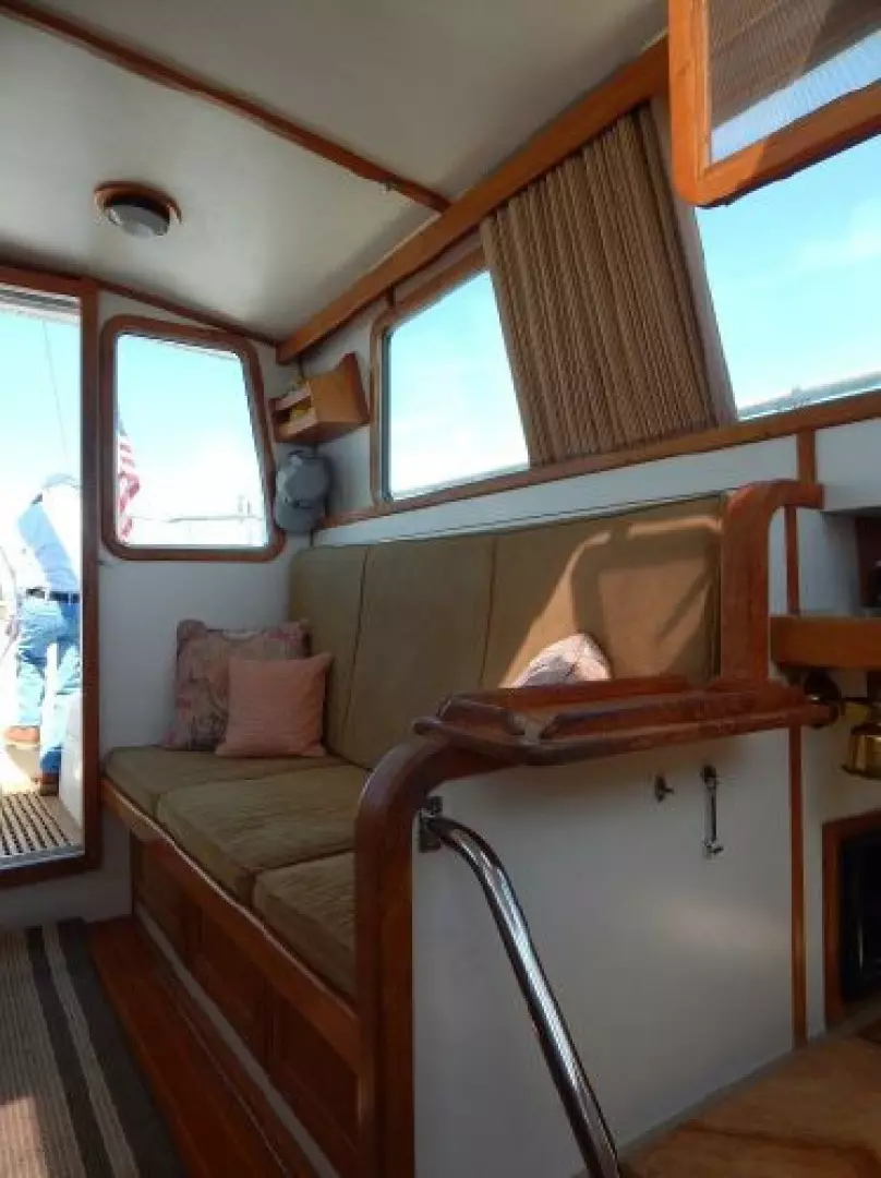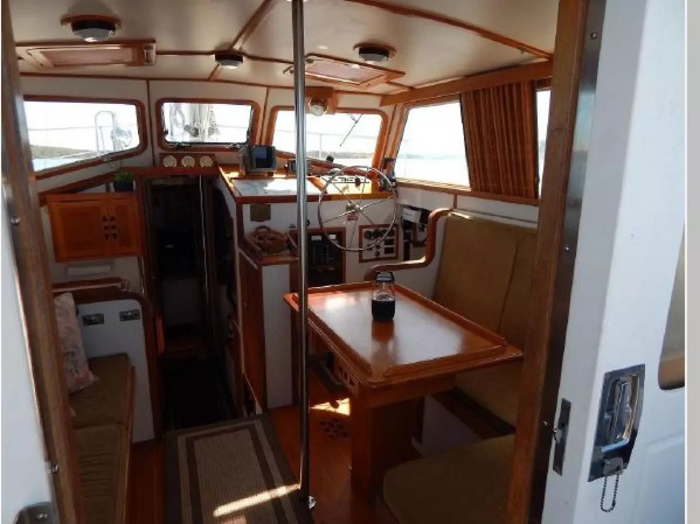 Up 3 steps to the Pilothouse with the helm forward to starboard, aft is an L-shaped settee, dining table and a settee to port.