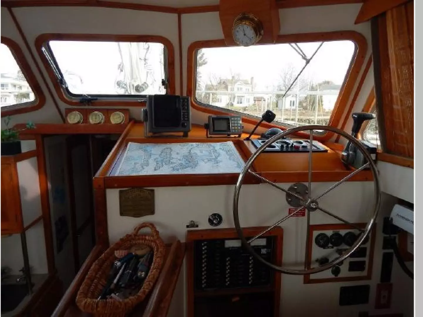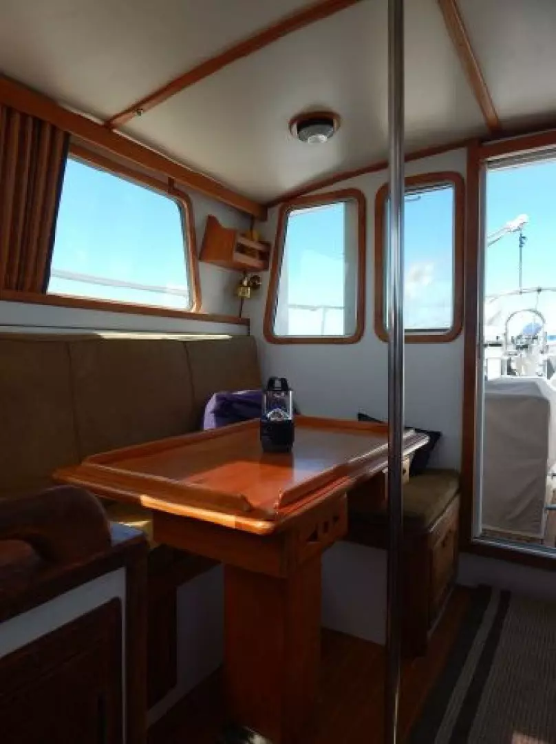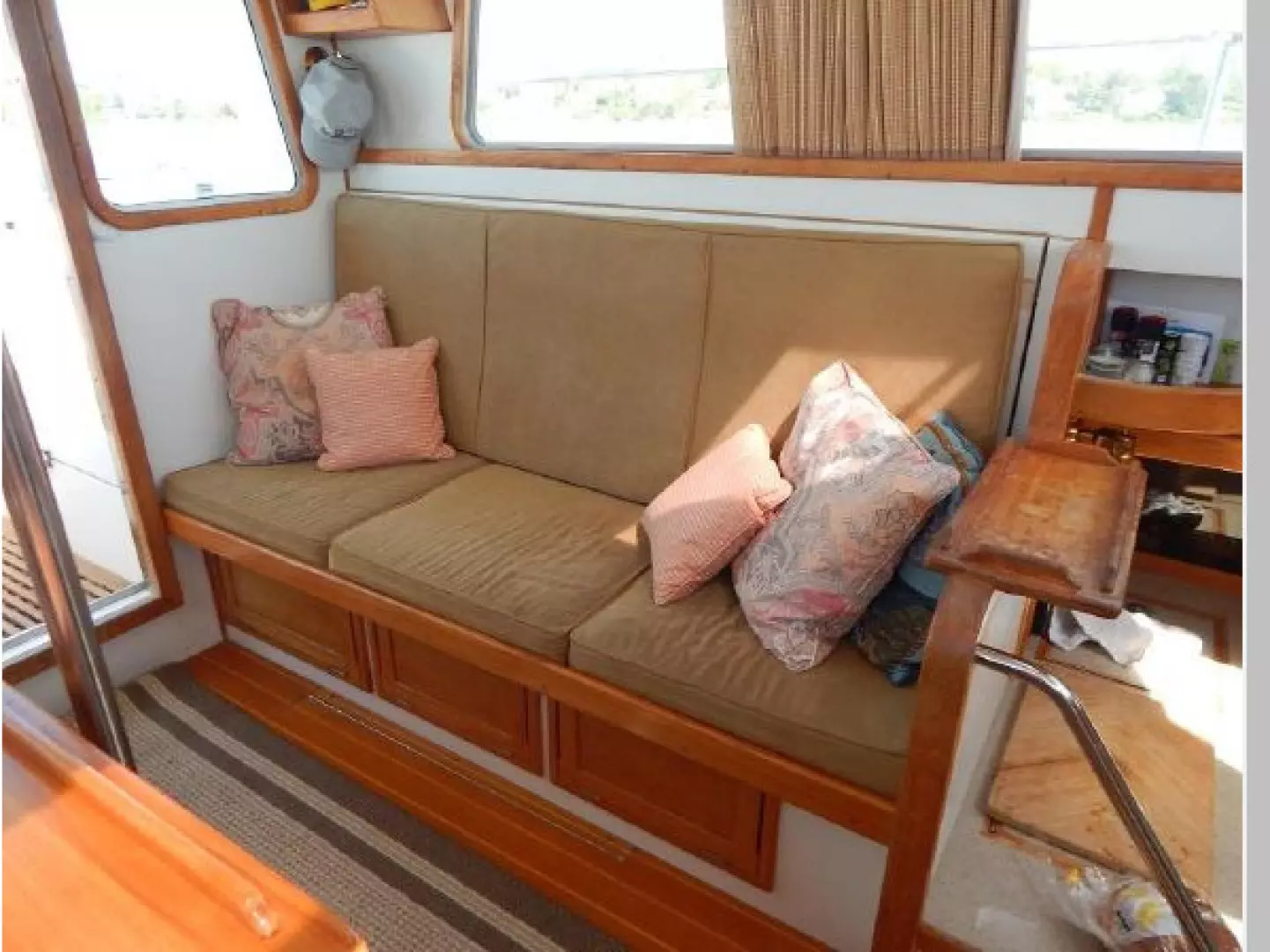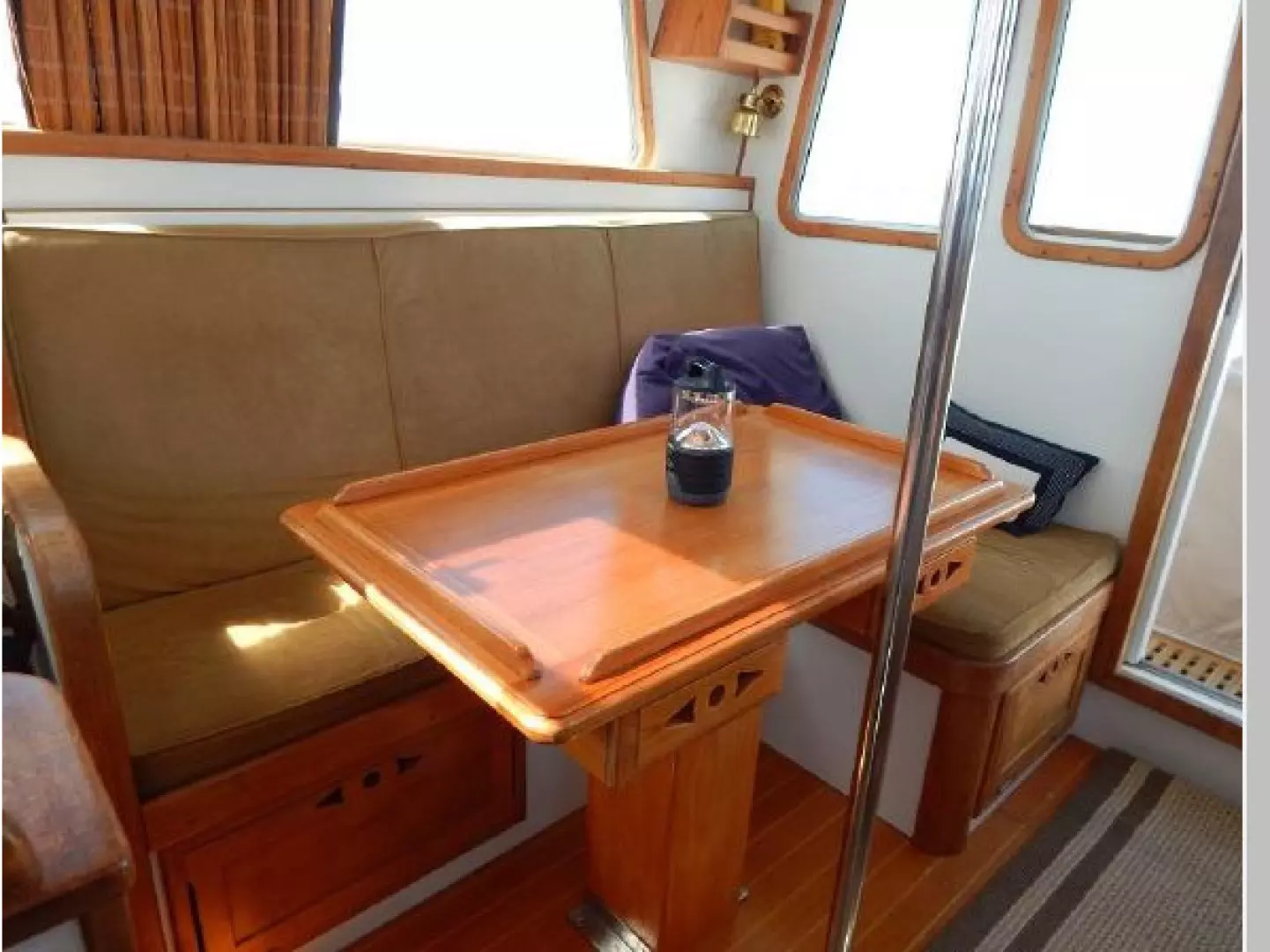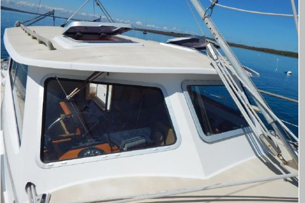There are 4 overhead hatches, 6 opening ports and a dorade for ventilation below. The Pilothouse has 2 overhead hatches, the center forward opening windshield and sliding windows port and starboard.
