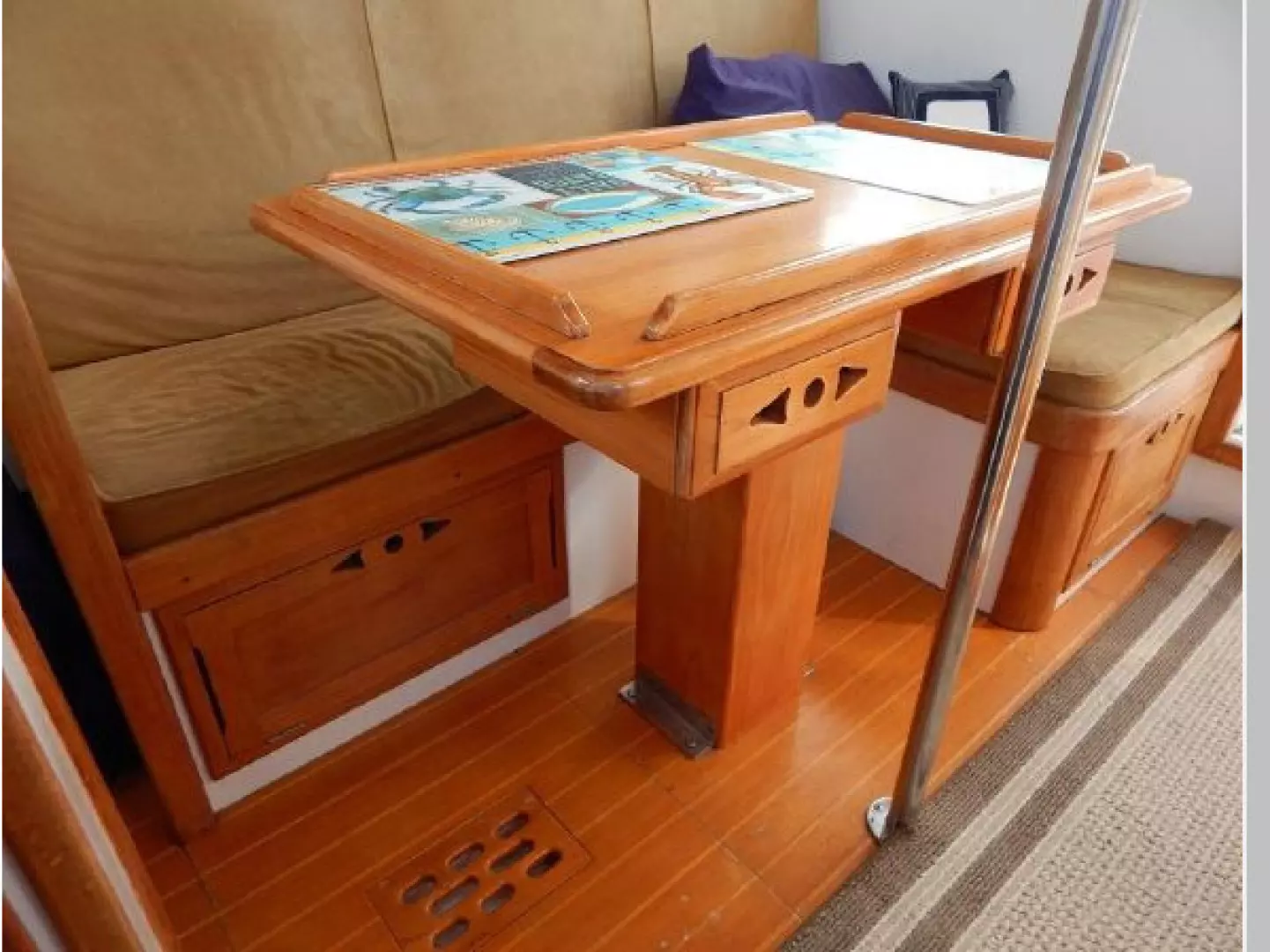 The sole is teak and holly throughout, The interior joinery is Herreshoff style with light teak drawers and doors, ceiling in the master and trim.