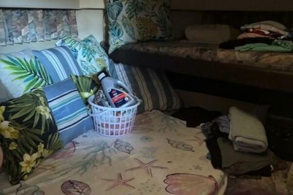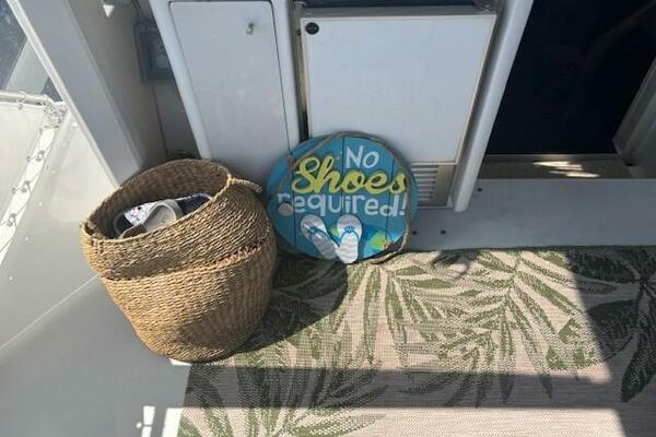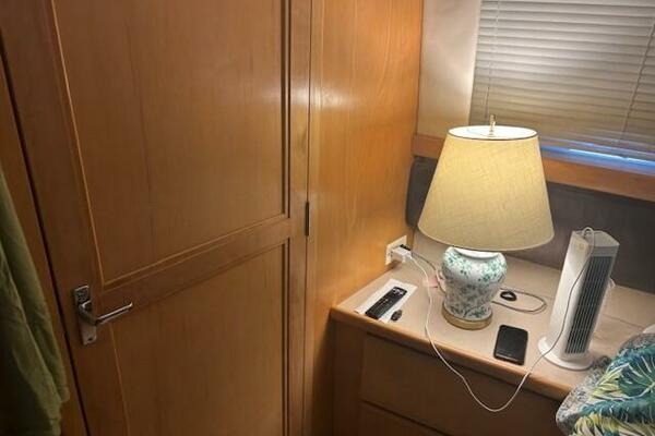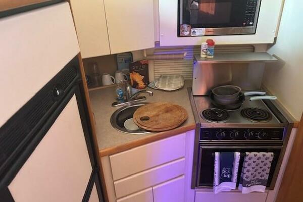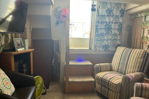 Spacious salon with comfortable seating, a convertible dinette, and panoramic windows for excellent visibility. The full galley is equipped with a refrigerator/freezer, microwave, electric stove, and ample storage – perfect for entertaining. Aft Master Stateroom: Queen berth, private head with separate stall shower, flat screen TV, hanging lockers, and vanity.