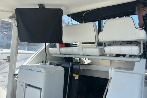Flybridge offers helm seating for captain and guests, with full instrumentation including GPS, VHF radio, depth sounder, and autopilot. The aft deck is ideal for al fresco dining, with easy access to the swim platform for water activities. Eisenglass full enclosure for weather protection.