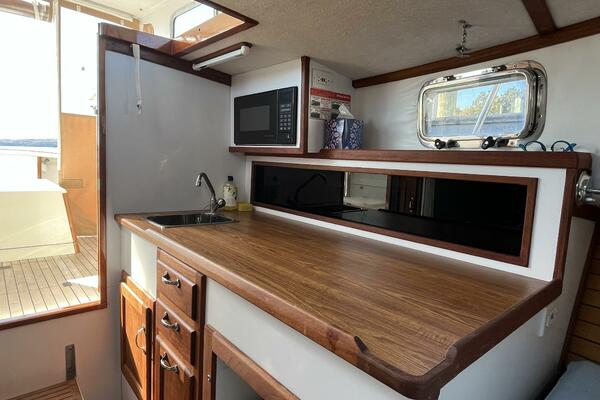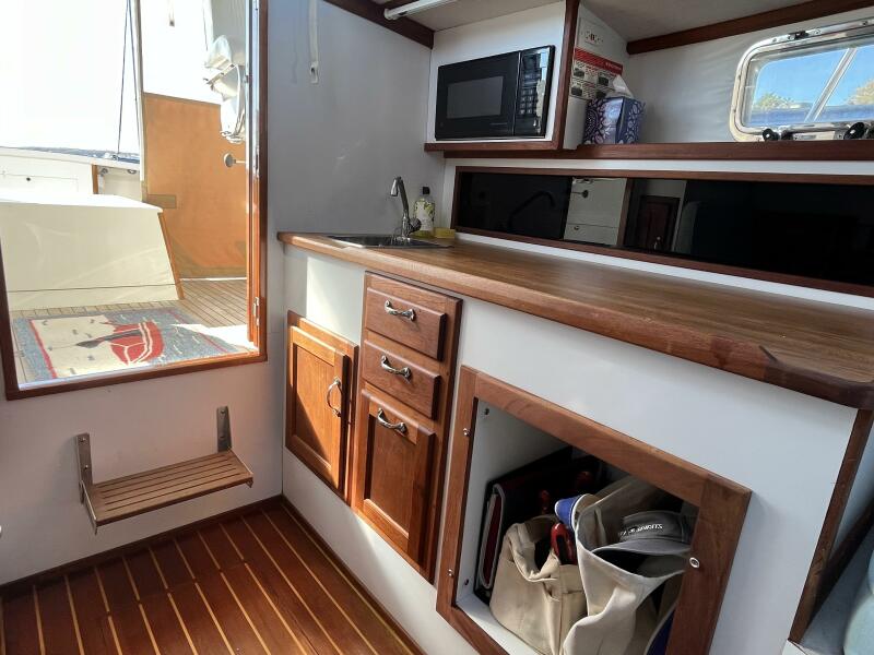 - Galley with stainless steel sink, pressurized fresh water, GE Microwave