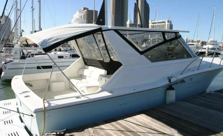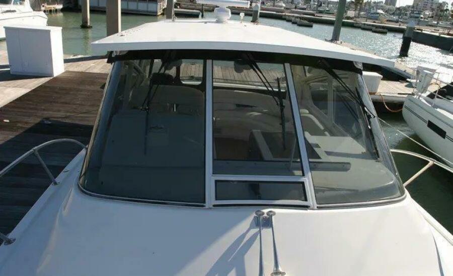 This is an excellent example of a well maintained and upgraded Sport Cruiser, perfect for evening excursions or weekend camping events. The aft cockpit features thigh high coaming padding and rear facing lounge chairs. The elevated fully enclosed air-conditioned bridge deck features two roomy L shaped settees with Sea-Dek flooring throughout. The Custom Hardtop provides weather protection combined with the vinyl enclosure which insulates the air-conditioned bridge deck allowing the opportunity to entertain in cruising style and comfort. Moving forward, the main cabin features a private head with an enclosed shower. The galley offers an electric stove top, refrigerator and microwave. The salon includes a spacious L shaped settee with a flat screen television. The V berth forward cabin is designed with a stand-alone island, walk around queen size berth midship allowing easy access to the forward berth.