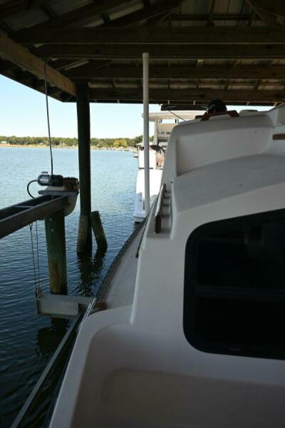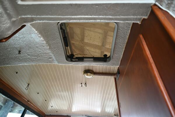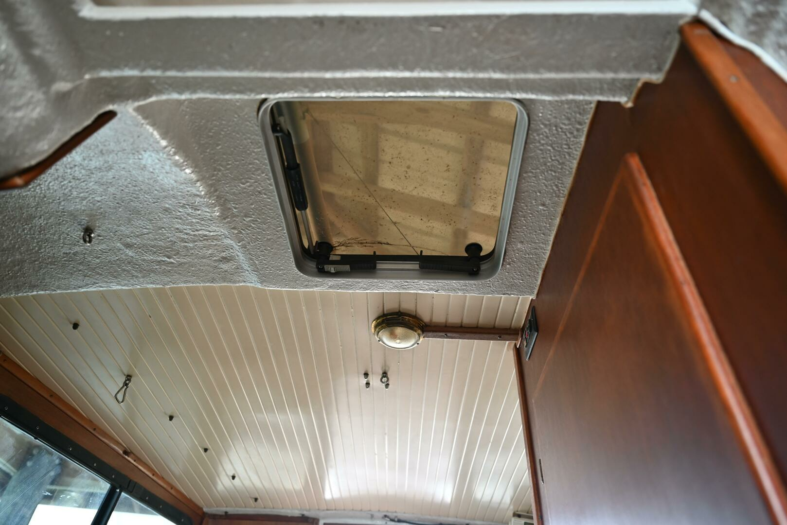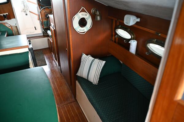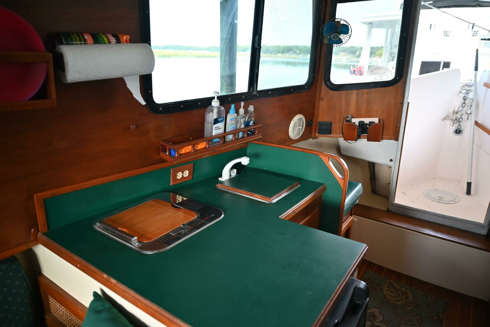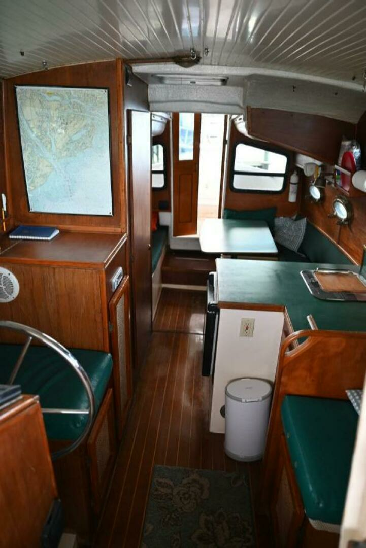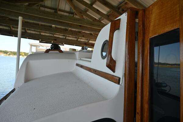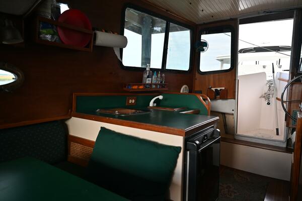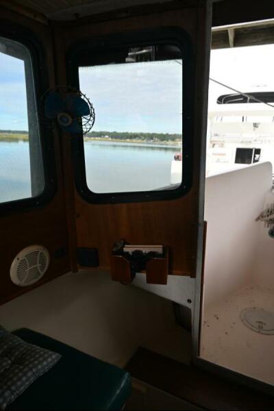 he Nomad Trawler has a roomy pilothouse with 6-feet, 3-inches of headroom, six windows, and an entry door all creating a comfortable, airy interior. The Trawler is equipped with a convertible berth, a galley flat, a sink, and a matching companion chair for the first mate. The forward bulkhead folds to provide a chart table. The main salon enjoys a full-size berth to starboard and a large dinette which easily converts to a double berth. The addition of the optional shower enhances her liveaboard facilities. Fourteen windows, two full-size doors, and an optional hatch for air conditioning insure a bright and comfortable interior.