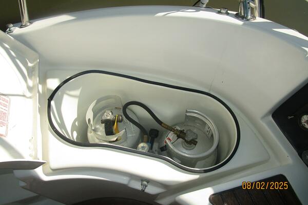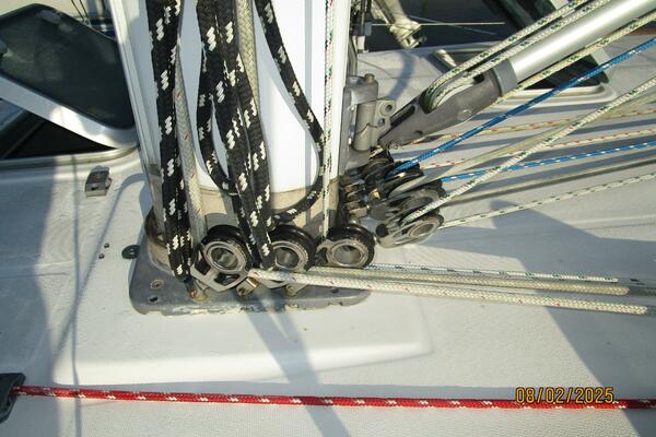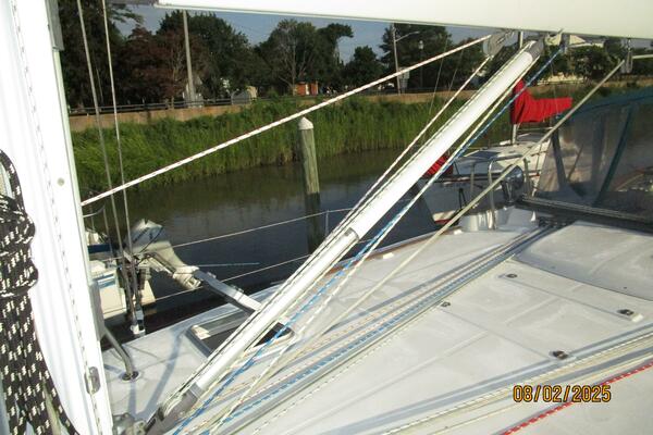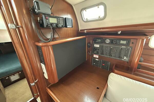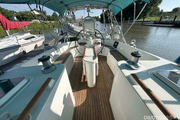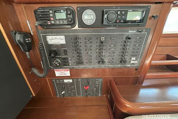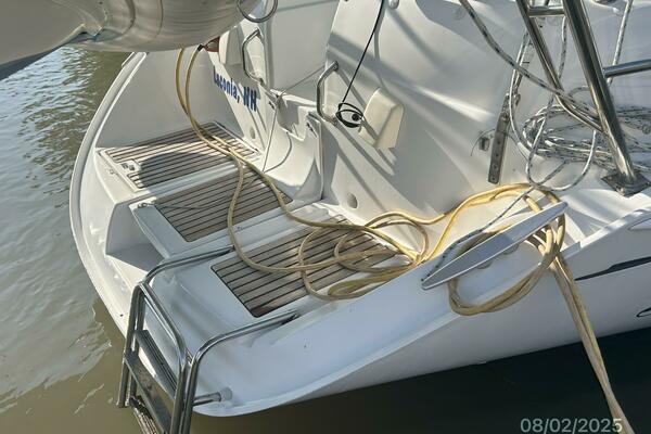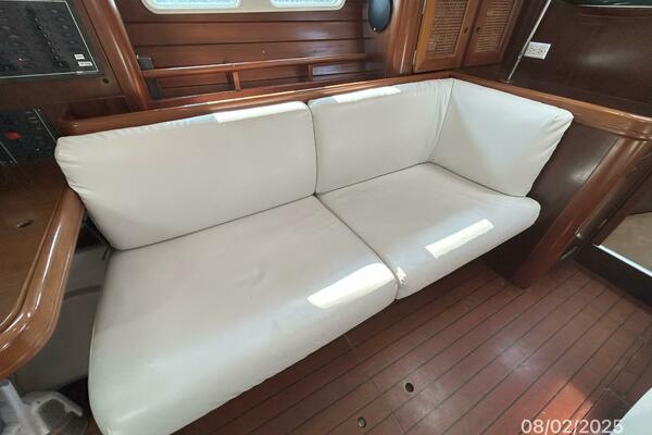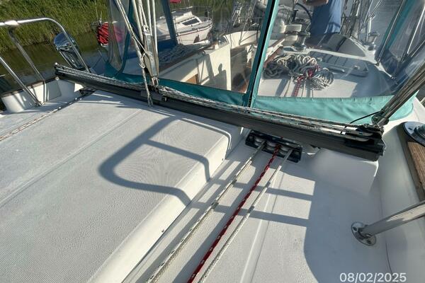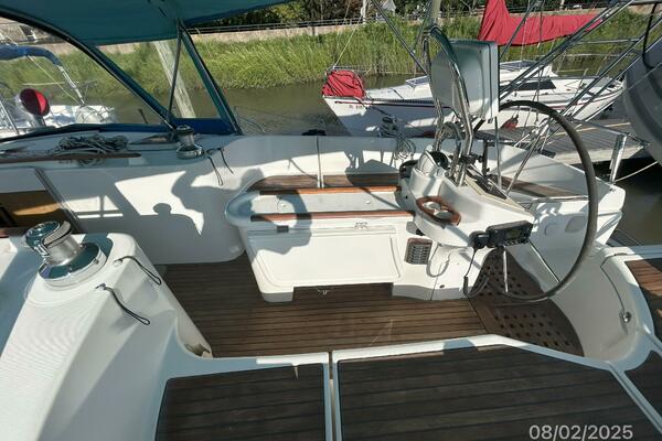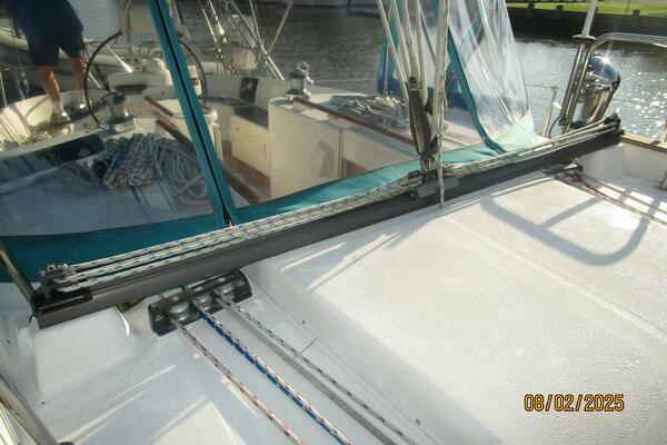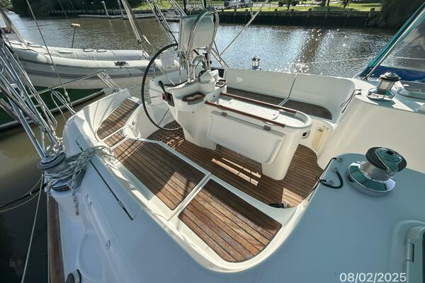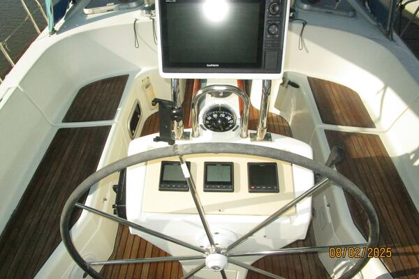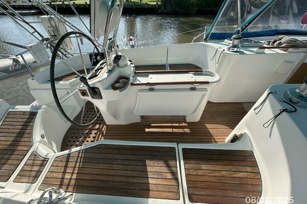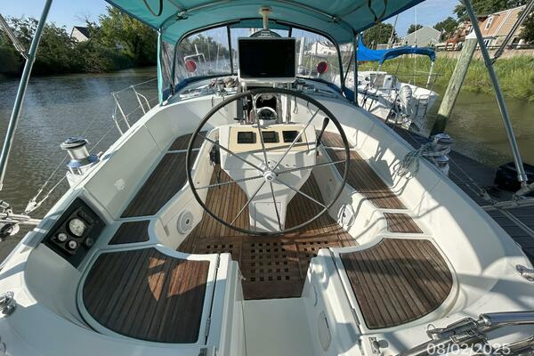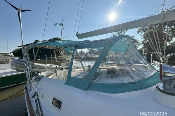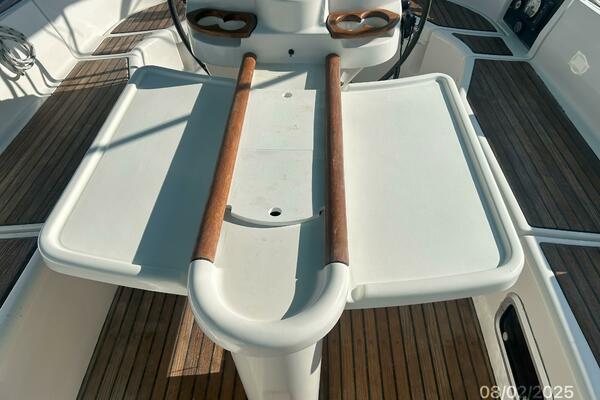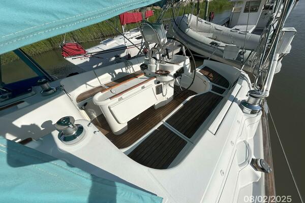The cockpit offers a teak deck, fold-up tables, dodger, bimini, connector between the dodger and bimini, Eisenglass enclosure on the sides and forward, stainless steel arch for the solar panels, transom pass-thru, auxiliary panel, propane locker, storage under the seating and seat cushions (In storage).
