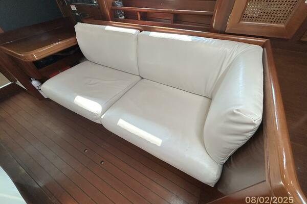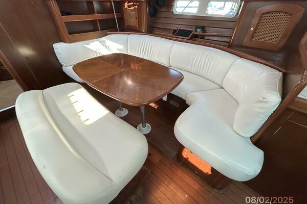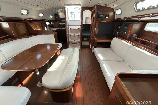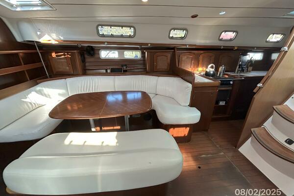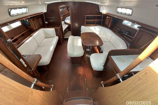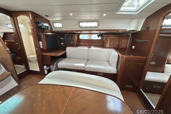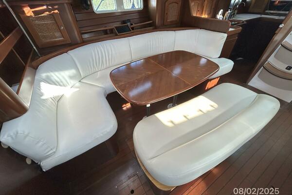 The salon offers wrap-around seating with storage, removable double pedestal table and benchseat with storage to starboard, benchseat with storage to port, 4 fixed ports, 4 portlights, 2 overhead hatches, shelves, teak sole, storage cabinets, fans and auxiliary access.