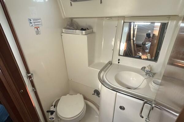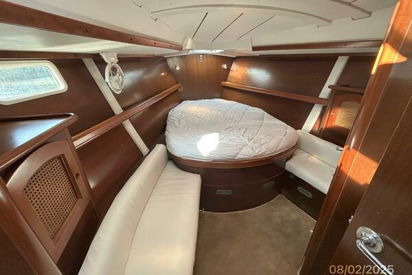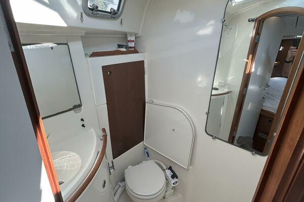 The forward stateroom offers an island queen size berth, fan, storage cabinets, shelves, hanging locker, benchseat with storage on each side, bound carpet over finished wood, 2 fixed ports, portlight, 2 overhead hatches, reading lights and an ensuite head, which also has access from the salon.