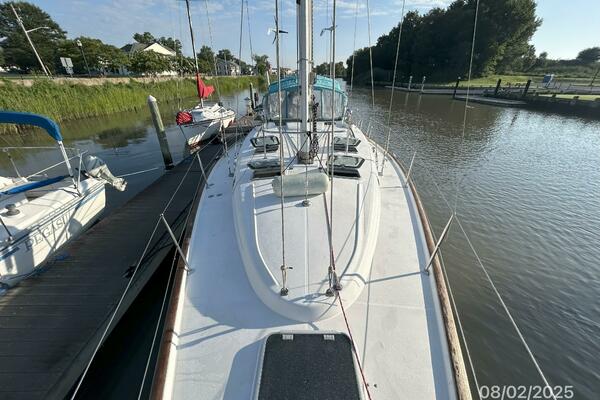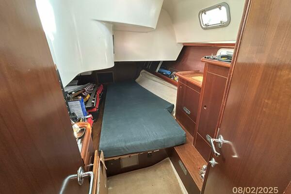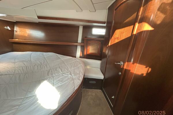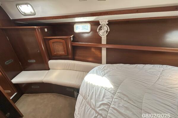 The aft stateroom offers a queen size berth (Presently using half for storage with mattress in storage), overhead hatch with a shade, 2 portlights, fixed port, hanging locker, storage cabinet, shelf, bound carpet over a finished wood sole and an ensuite head, which also has access from the salon.