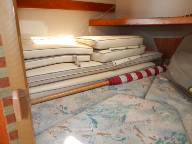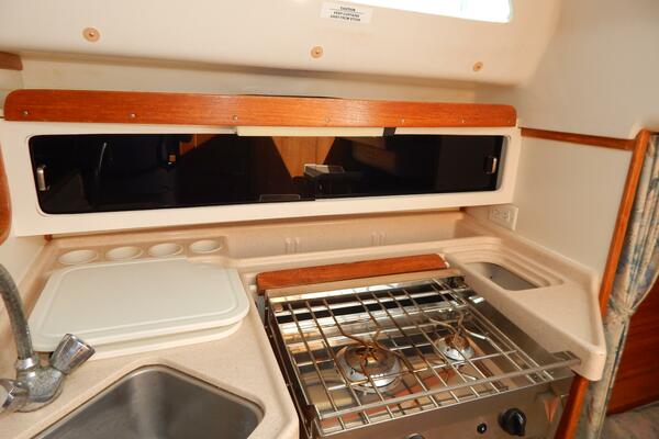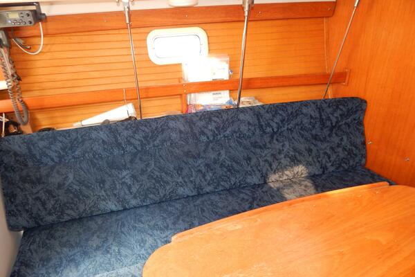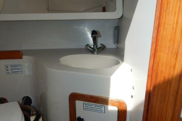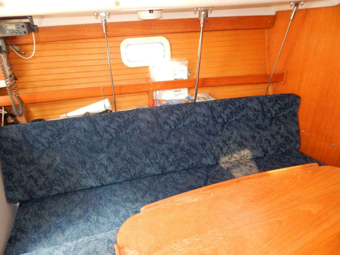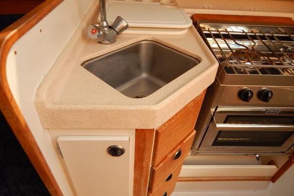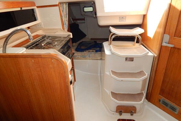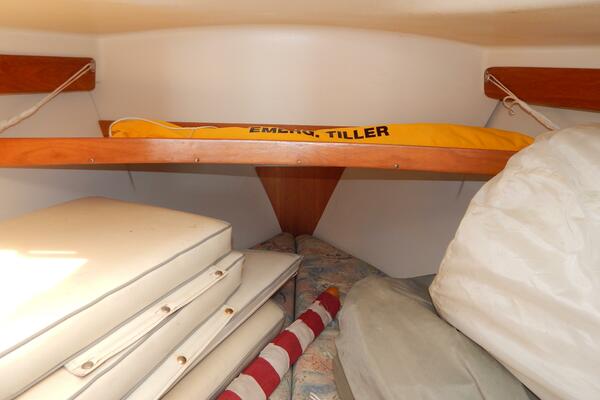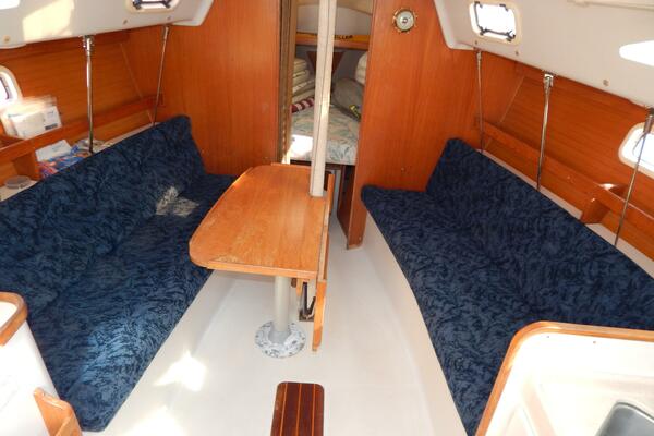 Furthest forward is the V-berth with filler, storage underneath and outboard shelves. Next aft is the salon with port and starboard settees, outboard storage shelves, a port side dining table with a starboard side leaf. Next aft to port is the enclosed head and to starboard is the galley, furthest aft is the mid-cabin with hanging locker. The cabin sole is molded fiberglass with teak and holly hatches,