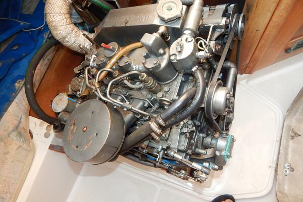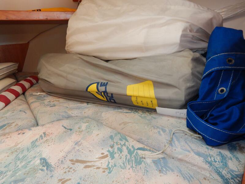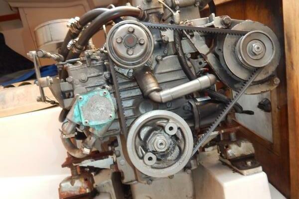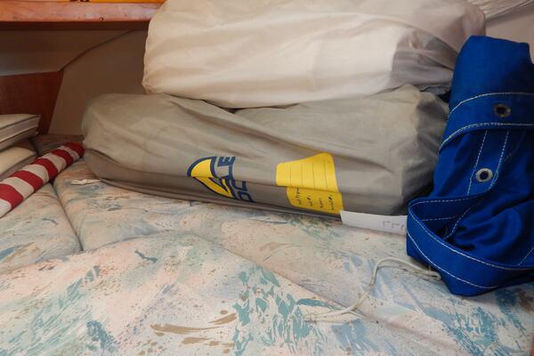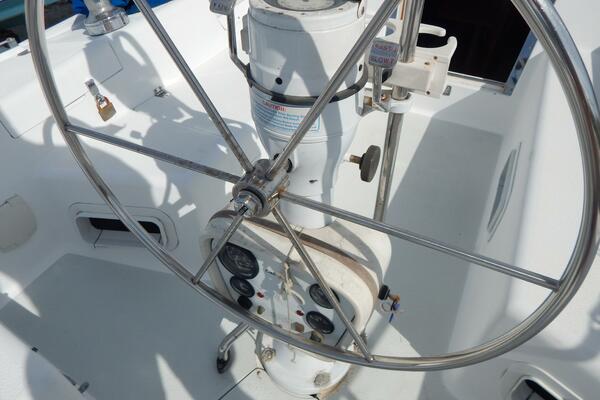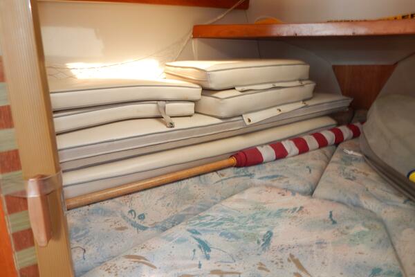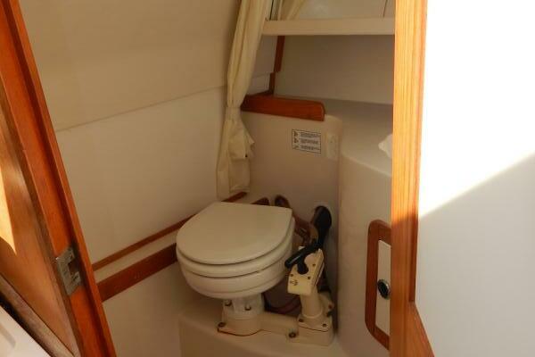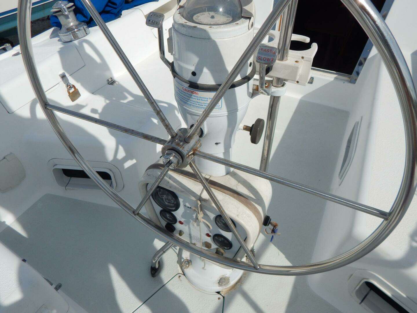 Furthest forward is the V-berth with filler, storage underneath and outboard shelves. Next aft is the salon with port and starboard settees, outboard storage shelves, a port side dining table with a starboard side leaf. Next aft to port is the enclosed head and to starboard is the galley, furthest aft is the mid-cabin with hanging locker. The cabin sole is molded fiberglass with teak and holly hatches,
