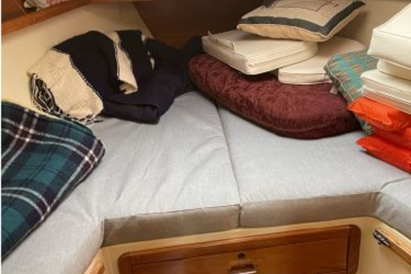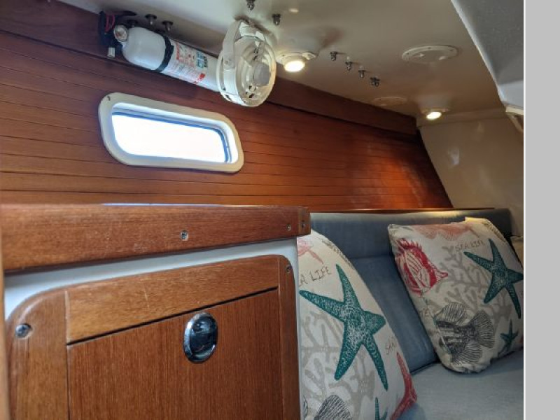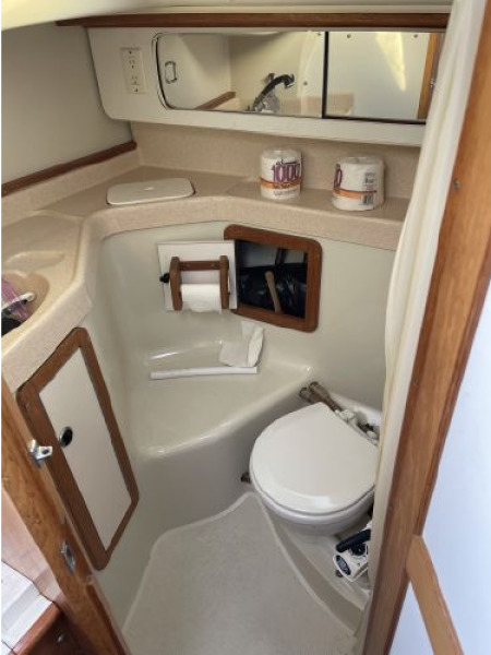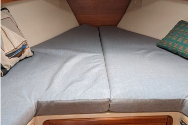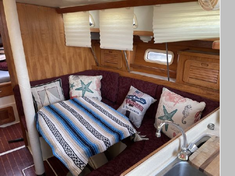 Since the introduction of the Mark I model in 1986, the Catalina 34 has built a well deserved reputation for possessing a classic blend of performance, comfort, and value. The devoted following of Catalina 34 owners now stretches worldwide. With this respected heritage in mind, Catalina has set out to design a fitting successor to this popular thirty-four foot sailboat. The result of this two year redesign is the Catalina 34 MkII. Every aspect of the Catalina 34 was re-evaluated to decrease maintenance, and increase reliability and comfort - both underway and at anchor. The experience of over 1,300 Catalina 34 owners proved the practicality of the masthead rig with fore and aft lowers, forestay, and backstay. The inboard shroud base leaves more room for secure footing on the non-skid deck and provides for narrow sheeting angles and the ability to carry large genoas. A new rigid boom vang and double ended mainsheet system make sail handling easier and more secure. The cockpit begins with two of Catalina's well known "sleeping length" seats. The handsome transom not only increases cockpit volume, but presents wide tapered coamings for additional seating options for captain and crew. The sleek new stem includes an unobstructed boarding platform, hot and cold fresh water shower, and extra wide boarding ladder that folds to become part of the stem rail. The ever popular stern observation seats are cleverly integrated into the rail. The skipper will find the traditional pedestal steering station with a new 40 inch stainless wheel. A new larger rudder delivers a level of precision and tracking through all points of sail, and visibility is increased with the new ultra-low profile ball bearing mainsheet traveler. The teak cockpit table was completely refinished in 2019. Low maintenance, high strength stainless steel rails have replaced all teak rails on deck. The over-size anchor locker comes with a standard electric windlass and new heavier anchor roller. Large two speed primary and secondary winches allow crew members to adjust sail trim single-handed. At the end of the day, the skipper will appreciate the standard "Lazy Mate" sail flaking system. The warm glow of satin varnished teak and ash first greets guests below deck. The newly sculpted settee and dinette cushions are highlighted by the striking new teak dining table, and two new fixed ports in the hull add a bright, open feeling to the expansive salon. The roomy new galley boasts a custom molded, one piece counter top; dry food locker; and overhead cup storage. The increased counter space conceals the built in trash chute under the cutting block top. Under the deep stainless double sink are even larger cupboards and drawers. There is an intigrated two burner gimbaled stainless range with oven. Three cedar lined hanging lockers and three huge double berths allow plenty of room for crew and overnight guests. The new wider aft cabin has an even larger berth, upholstered seat, and new bureau. A fixed port in the hull, as well as a large overhead ventilation - escape hatch, provide plenty of light and air flow. The roomy head is still aft, where it is closest to the cockpit. This uncommonly large compartment provides plenty of storage space, as well as a hot water shower and seat. A new one-piece counter top and minimum of horizontal surfaces allow more time sailing and less cleaning. Common to all Catalinas, the plumbing, electrical, and mechanical systems are well planned, consisting of quality components that are arranged for easy owner maintenance.