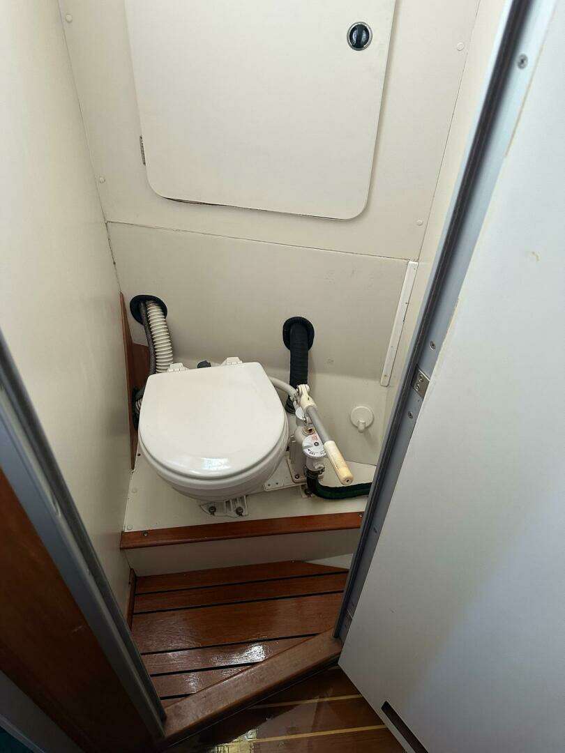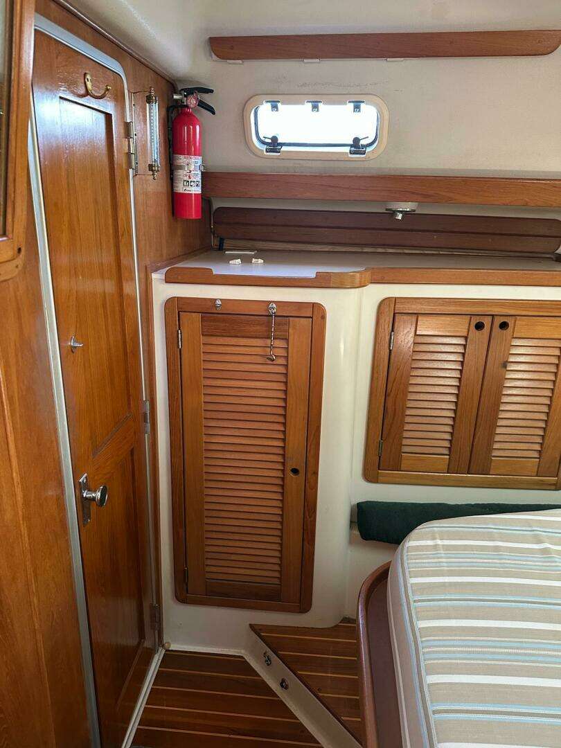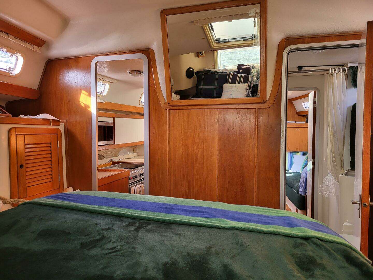 Air conditioned comfort with 6ft 5in headroom. Main salon has dinette to port across from a settee with storage behind. Aft to starboard is the nav station with entrance to the main head which has separate shower stall. Walk thru Galley is aft to port with 2 sinks, H&C pressure water, 2 burner propane stove & oven, microwave (2018) and refrigeration (2024). Aft is entrance to owners cabin with large berth with seats outboard, vanity and access to head. Aft head with electric fresh water toilet, shower. V-Berth forward with private manual head and sink. 6 solar vents in cabin. Macerator, Y-valve for heads, holding tank, hot & cold pressure water.