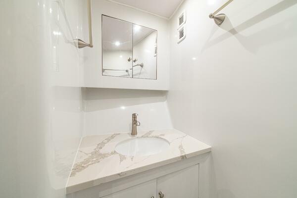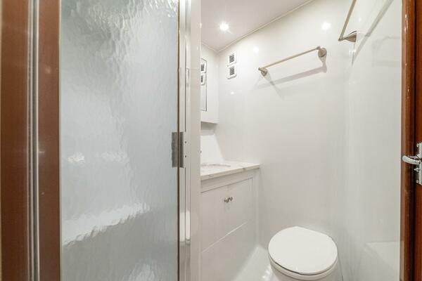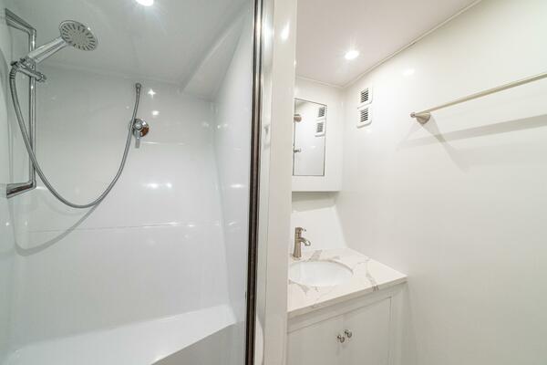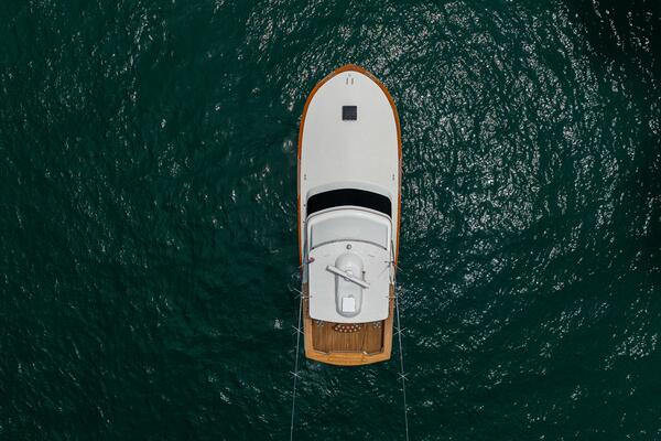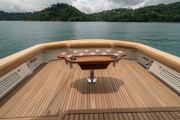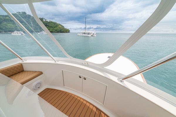 Her warm teak interior features a U-shaped salon sofa with abundant storage, pop-up Samsung TV, and a well-appointed galley with JennAir fridge drawers, slide-out liquor cabinet, and quartz countertops.