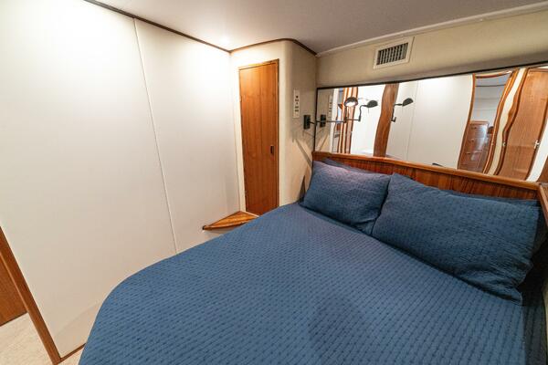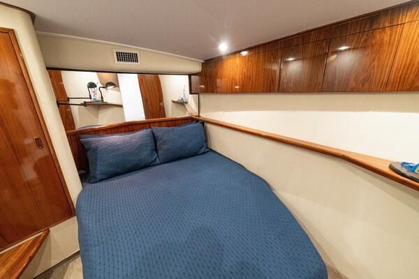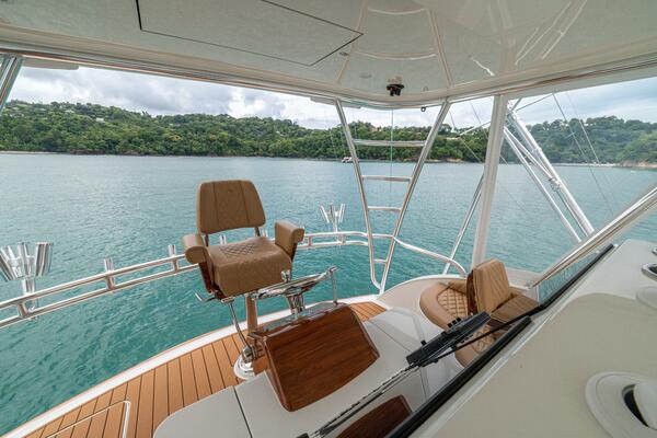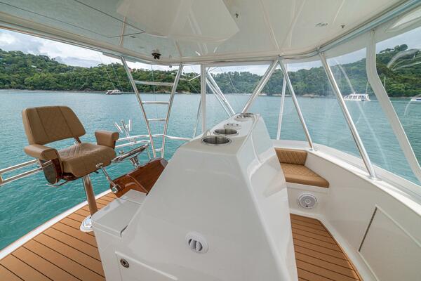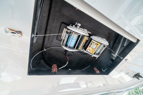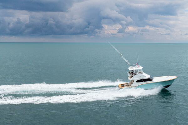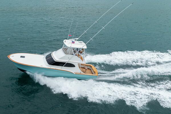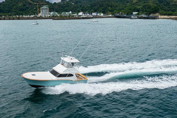 She offers two comfortable staterooms, including a forward cabin with rod and gear storage, and a master with full-size berth, ensuite head, and six built-in storage cabinets. The teak-decked cockpit is tournament-ready with mezzanine seating with AC, freezer, ice bin, and JL Audio sound system, while the center-console flybridge sports Release Marine seating, helm AC, SeaDek flooring, and a full Garmin and Furuno electronics suite.