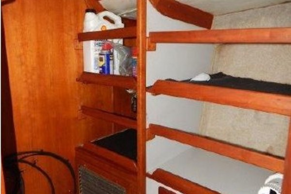 Furthest forward is the V-berth with storage outboard in cabinets and the large storage closet aft to port. Next aft is the main salon with a port dinette, large dining table mounted to the bulkhead and starboard settee with navigation station. Aft to starboard is the head with ample shower stall, to port is the galley and furthest aft is the Master stateroom with a custom Select Comfort air chamber mattress on the large double berth.