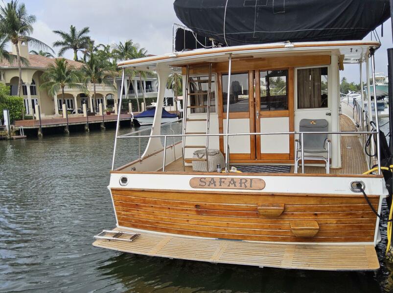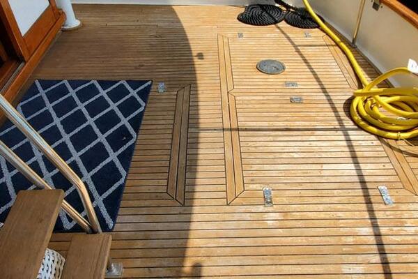 From the large cockpit there is an aluminum ladder with Teak step that provides access to the flybridge. Upper bridge offers a second helm station. The deck above the aft cockpit provides a davit and storage for the dinghy.