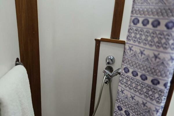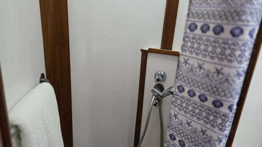 Down the steps in the companionway to starboard is the comfortable guest head. Complete with a vanity and storage, full shower and washer/dryer unit.