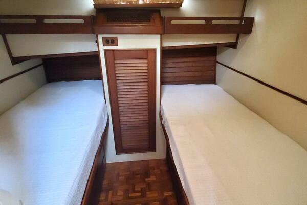 Forward down four steps to the portside is the guest room with two (2) side-by-side berths. A storage locker divides the beds at the port hull side. There are large storage drawers under each berth. Across the hall is the guest head.