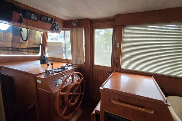 Beautifully appointed U-Shaped galley with Teak cabinetry, double stainless sink, refrigerator and freezer, abundant storage both below and above counter, with excellent panoramic views out the windows. Across starboard is the lower helm control station.