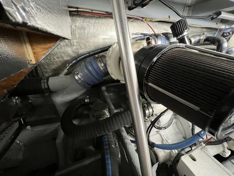 - Raw water cooled with raw water/exhaust gas mixing risers, and flexible hoses to fiberglass surge pipes & mufflers w/ side discharge