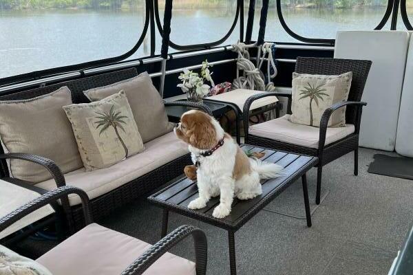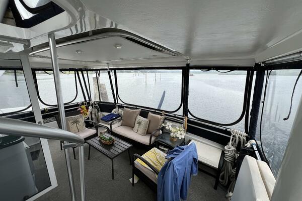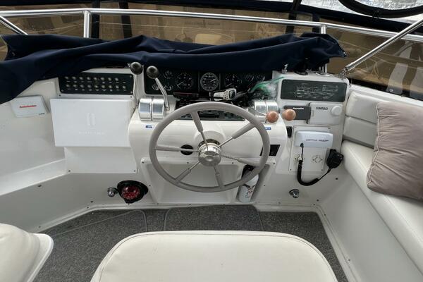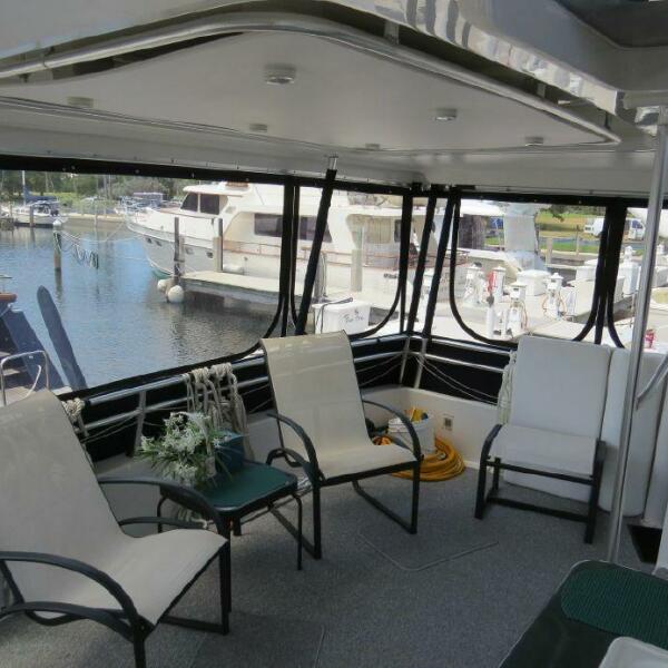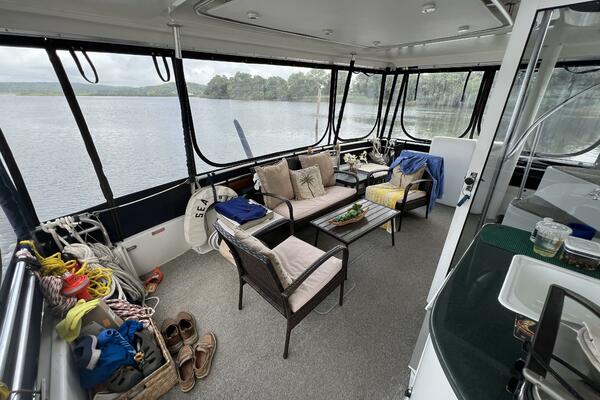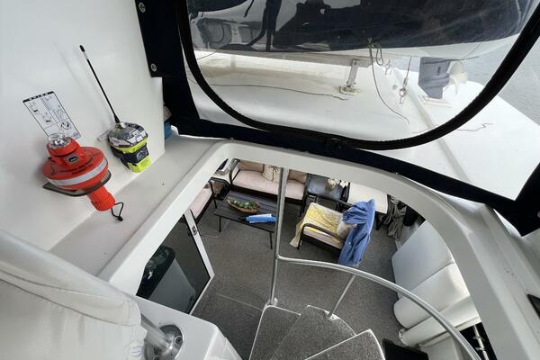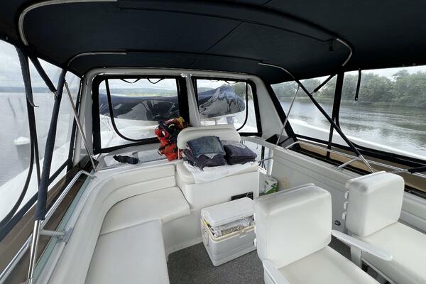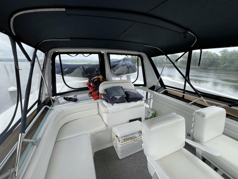 - Two helm chairs and bridge L shaped seating to starboard with vinyl cushions on flybridge and a deck seating w/ table