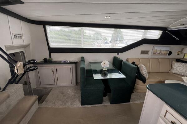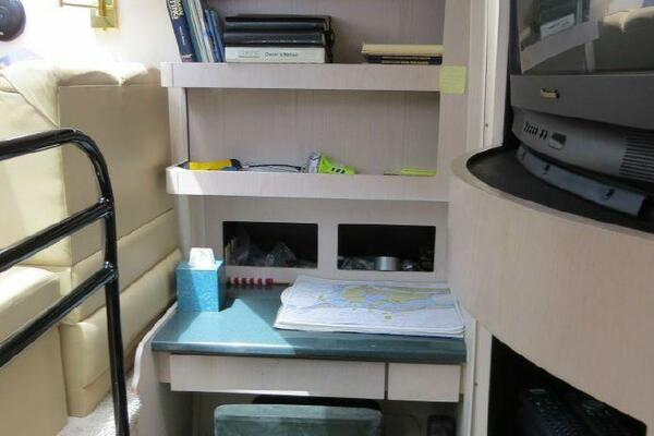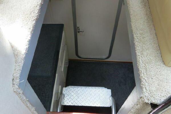 - Salon has dinette to port, galley to starboard, settees port and starboard forward and steps down to office area.