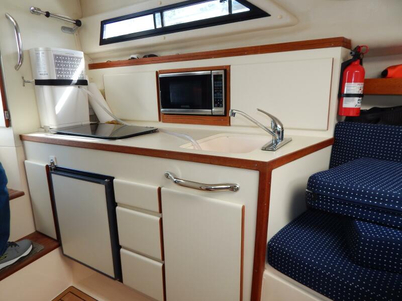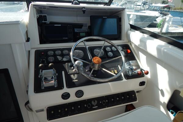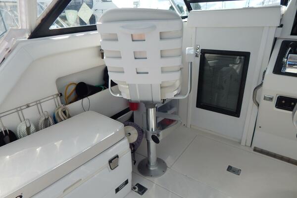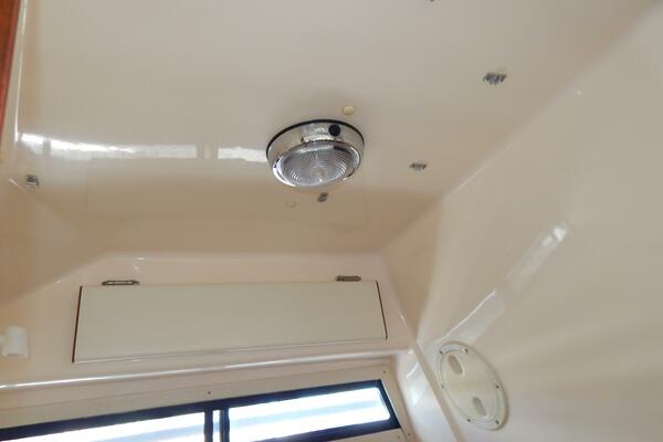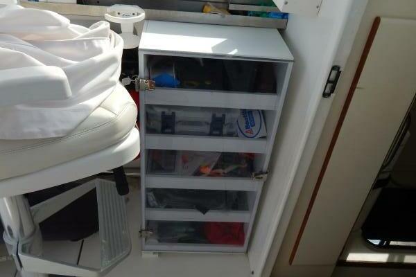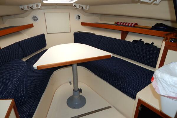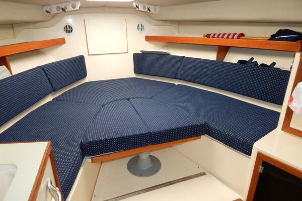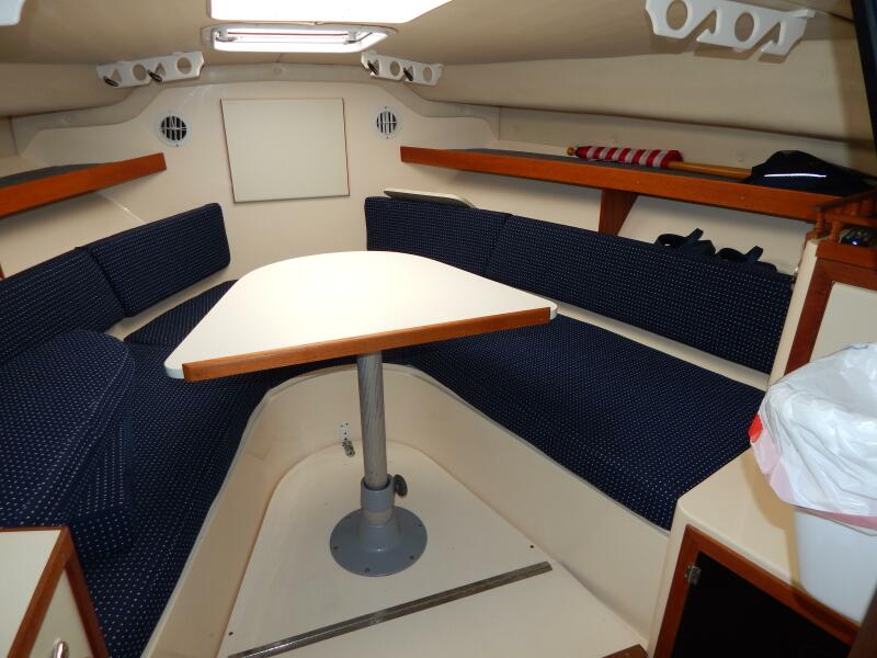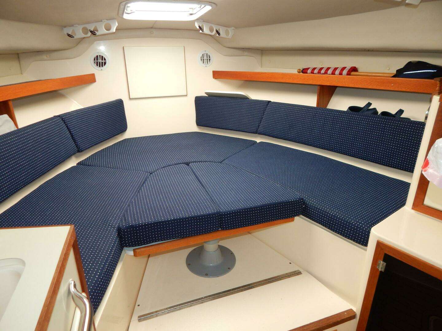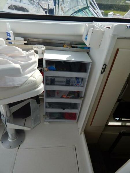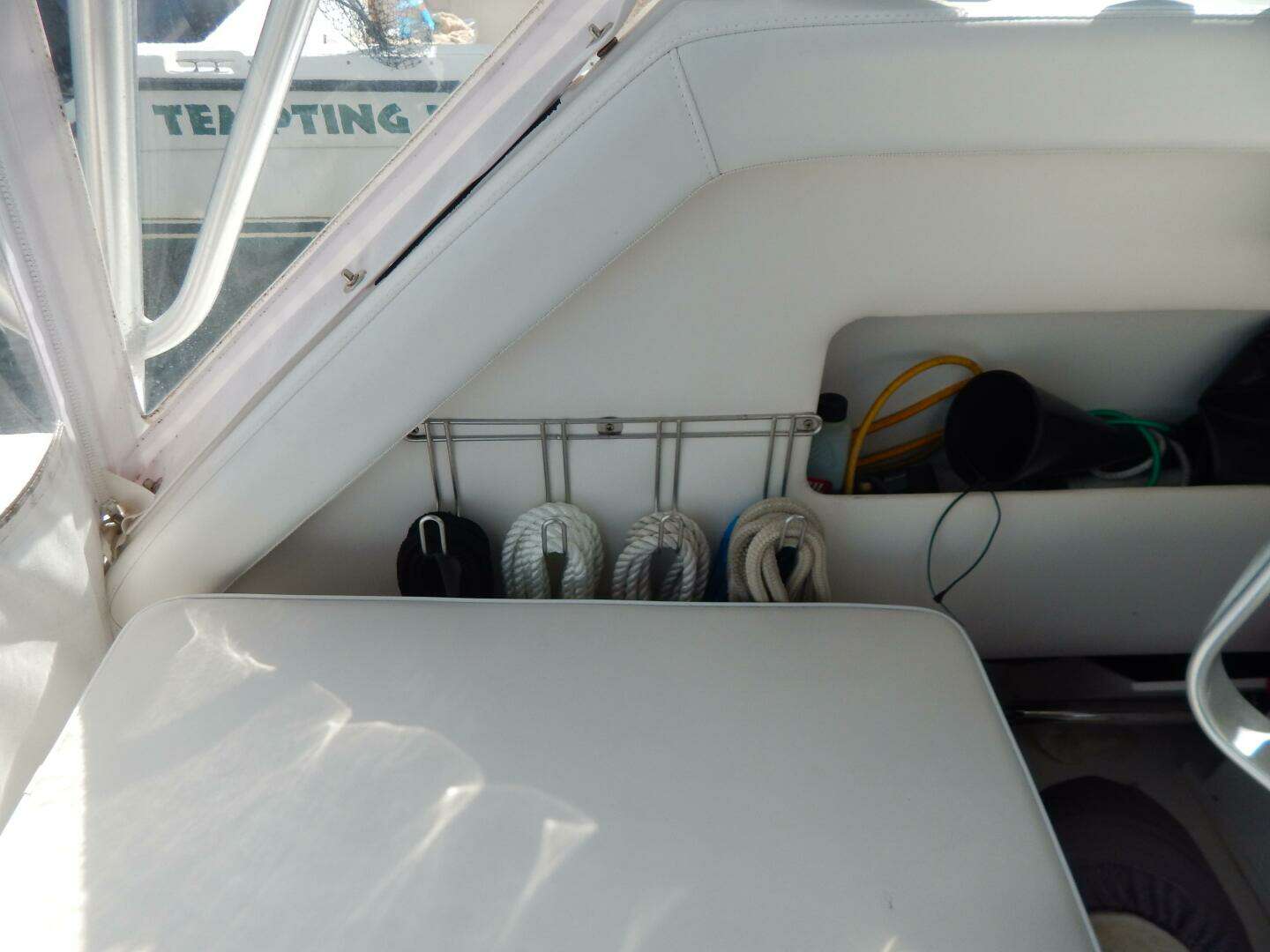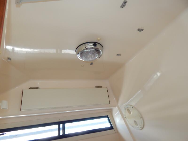 A convertible Dinette, new table, V-berth with new cushions, new shelves outboard, enclosed stand up head with shower aft to starboard and a galley aft to port. Up three steps to the Bridge deck with port and starboard helm seats, new, and custom tackle center, new.