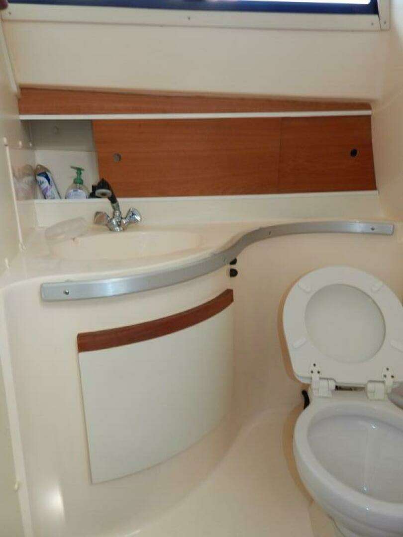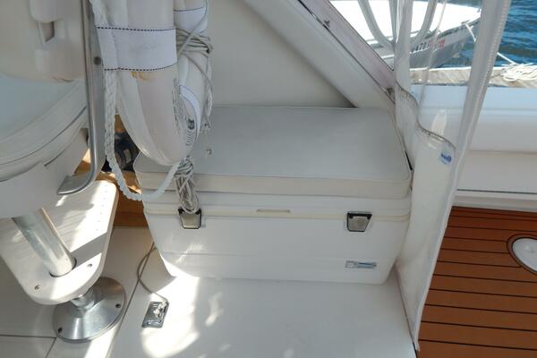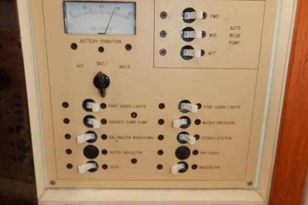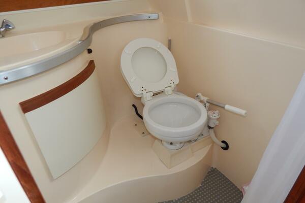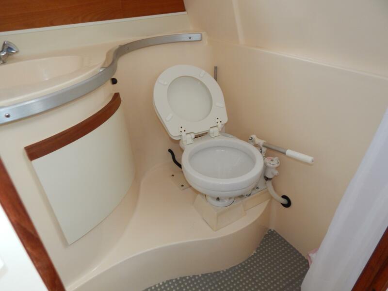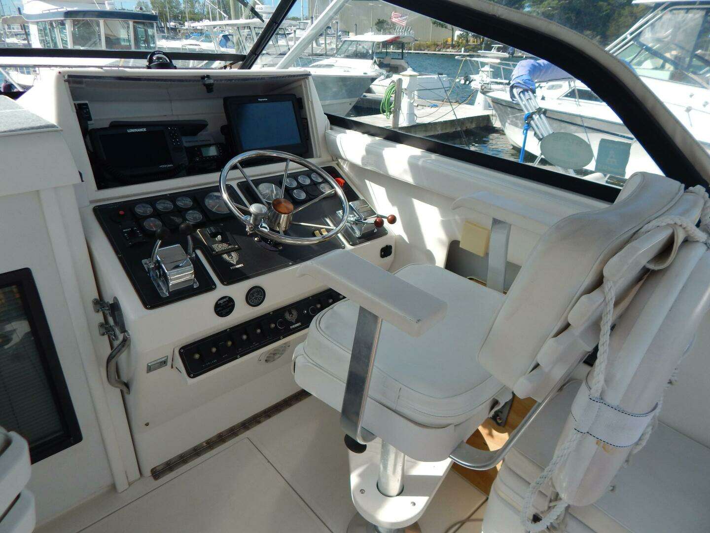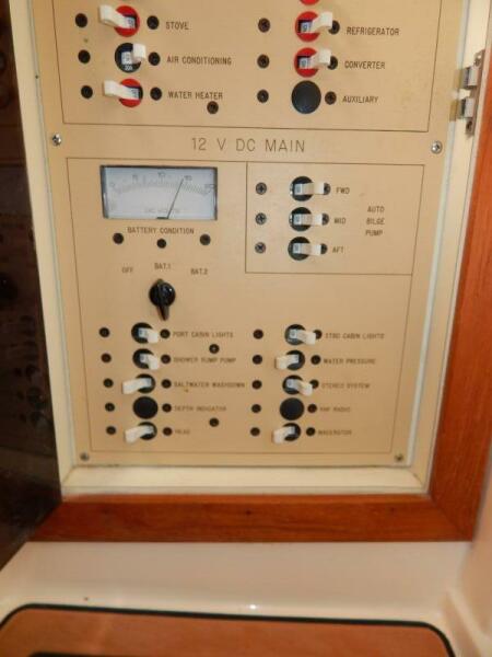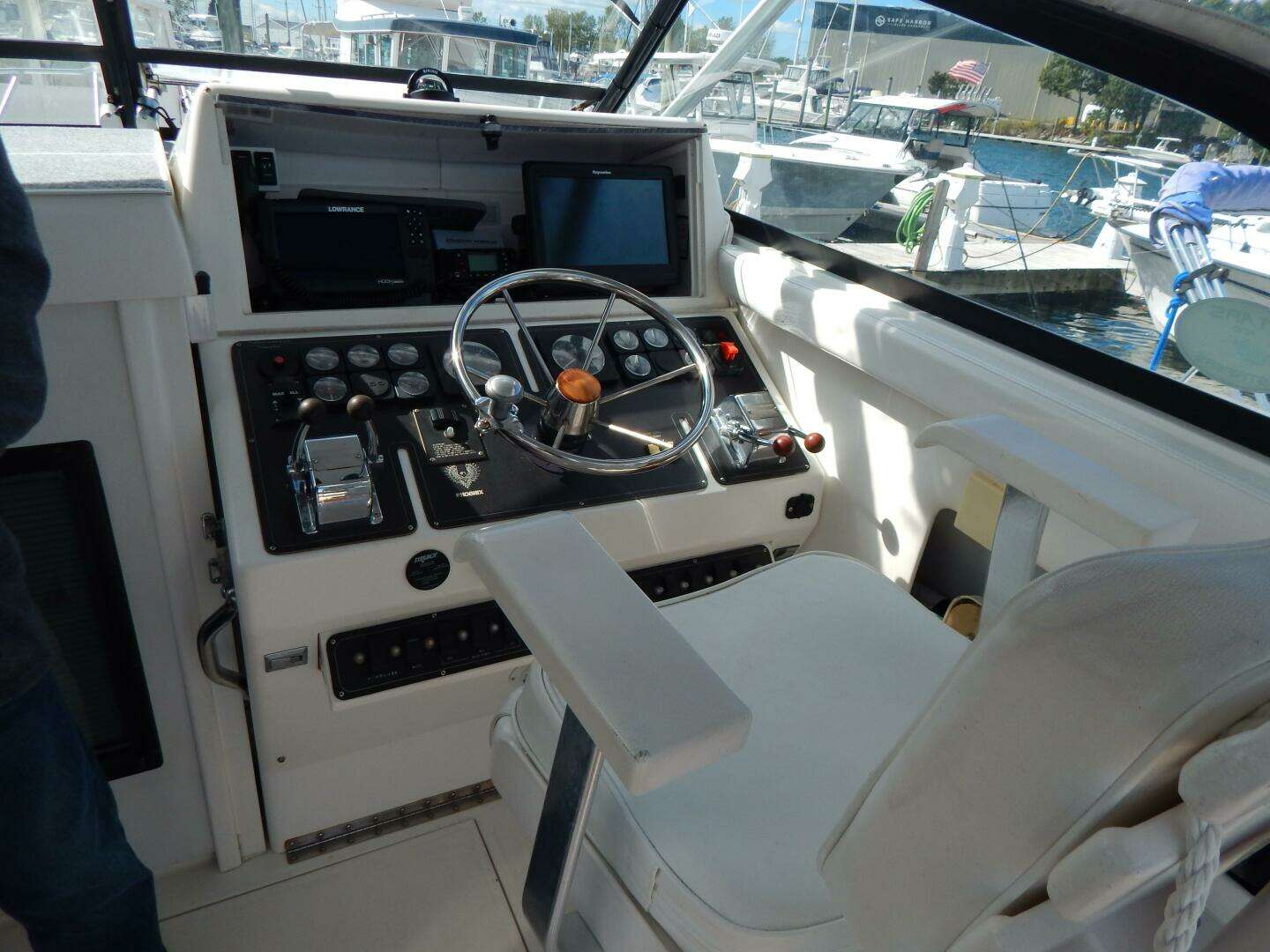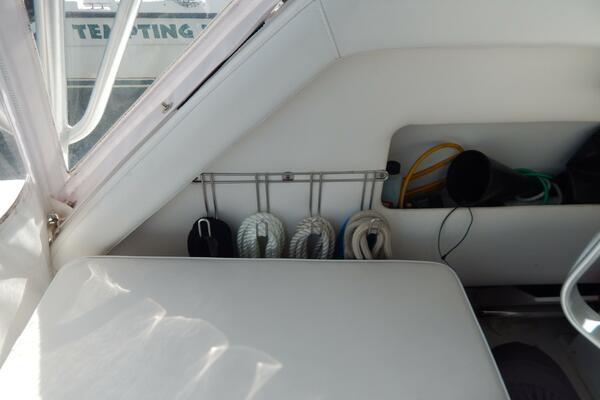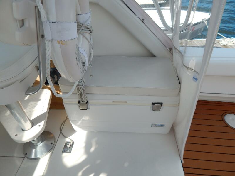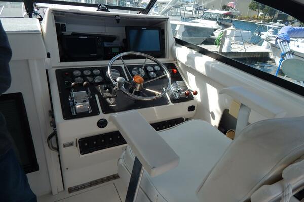 A convertible Dinette, new table, V-berth with new cushions, new shelves outboard, enclosed stand up head with shower aft to starboard and a galley aft to port. Up three steps to the Bridge deck with port and starboard helm seats, new, and custom tackle center, new.