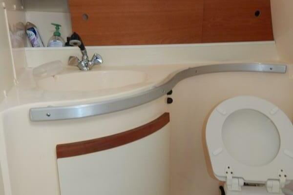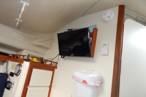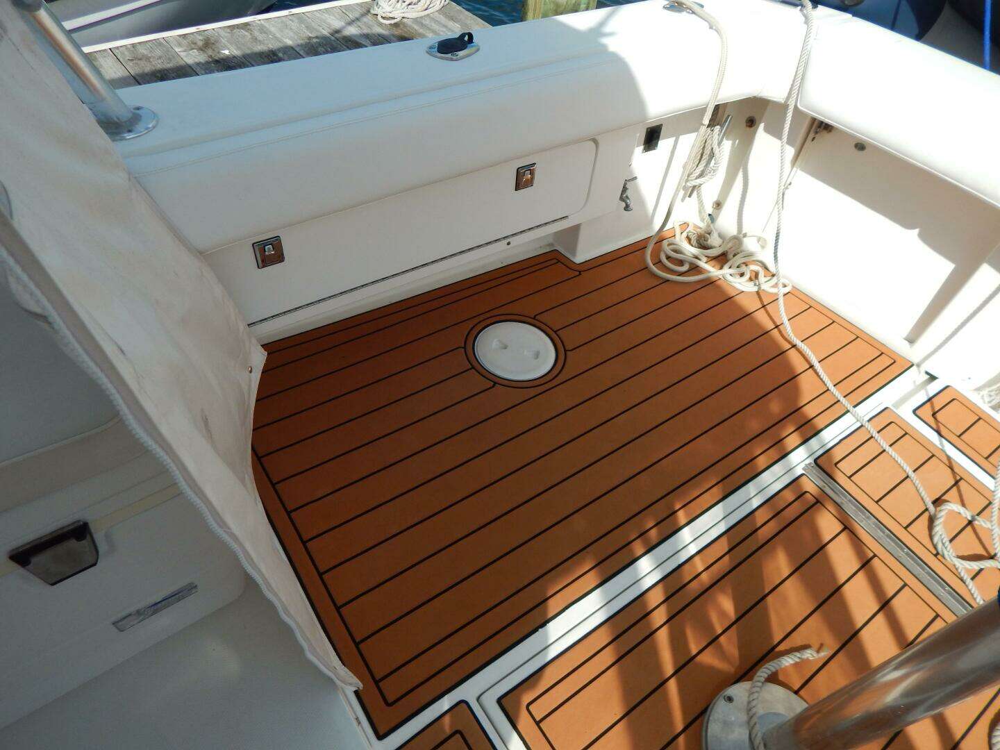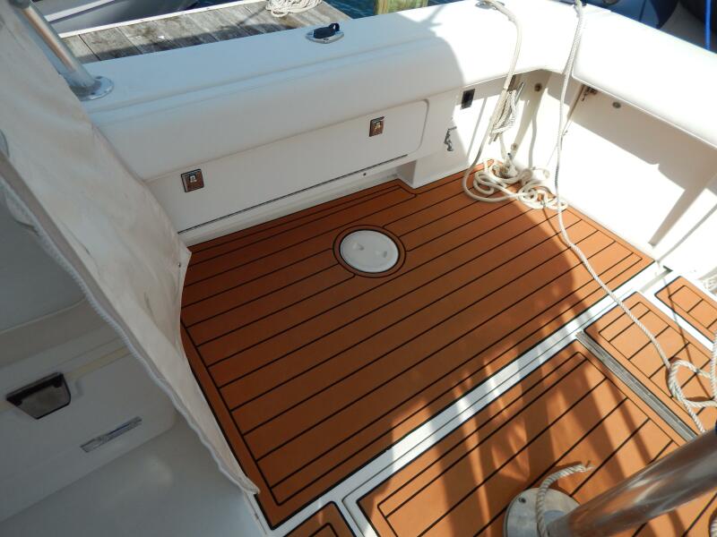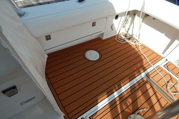 The sole is synthetic teak. There are 2 overhead hatches, 1 fixed and 1 opening. There are new overhead rod holders over V-berth.