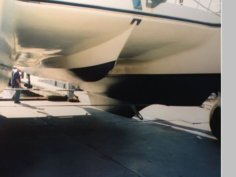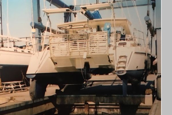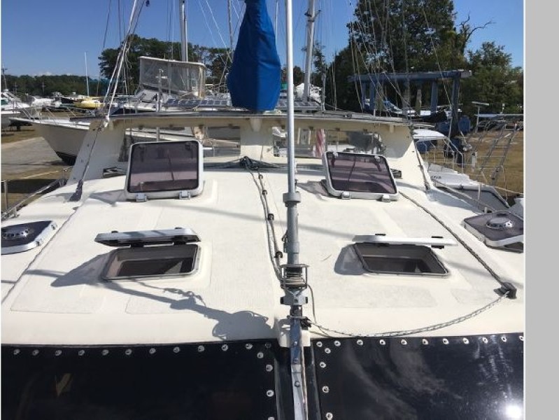 Her cockpit is quite large and has a custom Hardtop bimini with hard dodger. A unique, custom designed, retractable teak/stainless steel swim platform between the side hulls aft. A solid foredeck not only adds to her strength but also adds storage, an anchor locker and ease in getting around the boat.