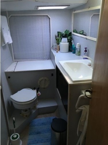 The Port hull has an other double stateroom also with 3 opening hatches, fan, reading lights, mirrors, wash basin and closet. Walking forward one will find the large navigation station with full size chart table as well as abundant storage. Forward is a large head with shower, washbasin and PAR ITT head with Y-valve. (holding tank located under the foredeck).