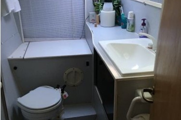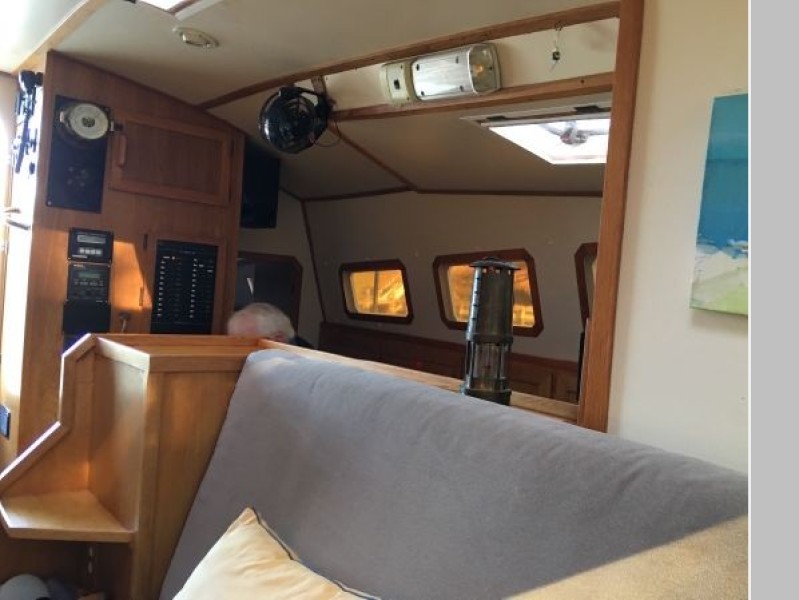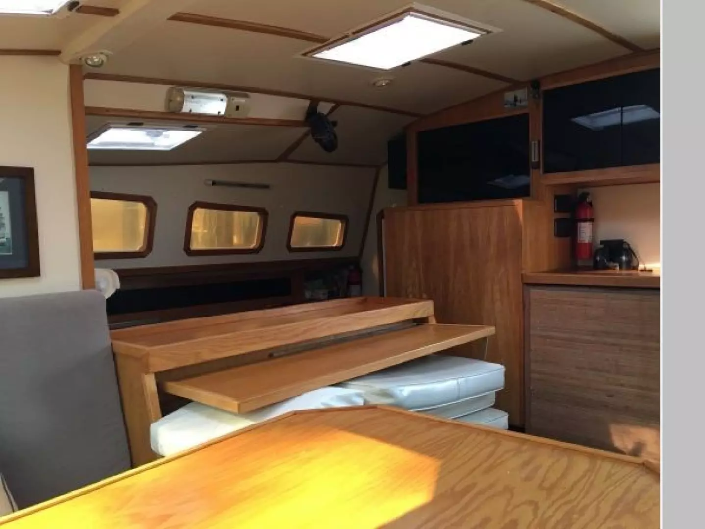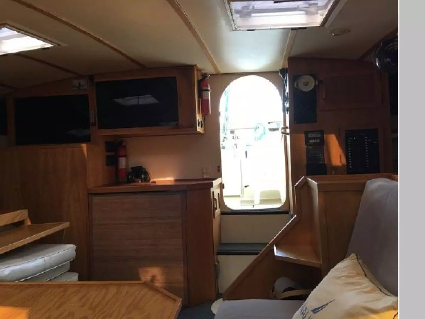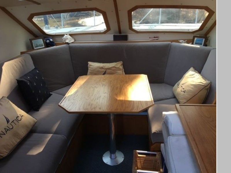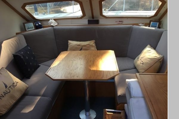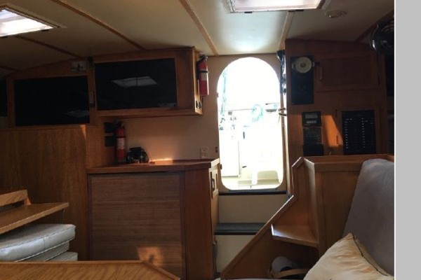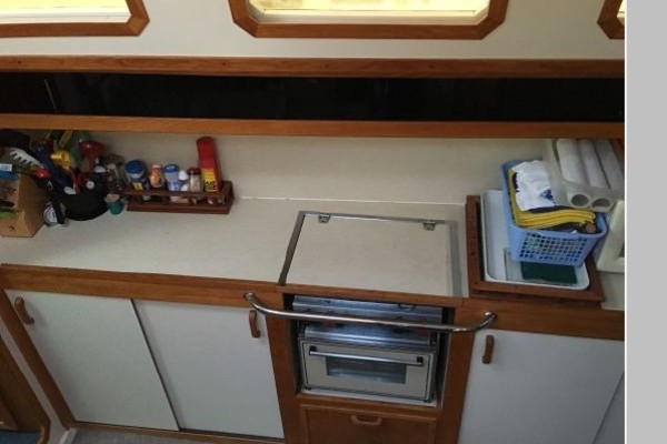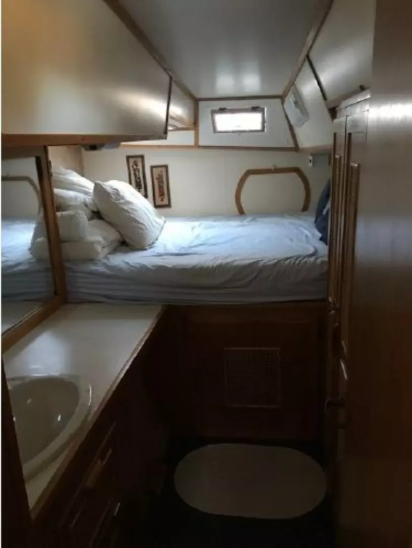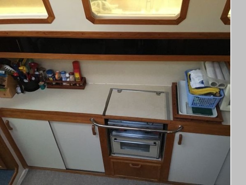 This designs lends to a comfortable live-aboard layout, with high standing headroom throughout. The Main salon consists of a large U-shaped dinette with swiveling dining table and ample seating for six (there is an extension to seat 8). She has bright white oak and Melamine trim throughout, 4 recessed LED lights, TV, liquor cabinet, air conditioning and extensive vented storage lockers and an audio/radio with 4 speakers..