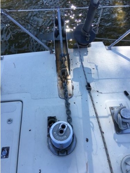 - Lewmar electric anchor windlass with deck foot switches and hand remote