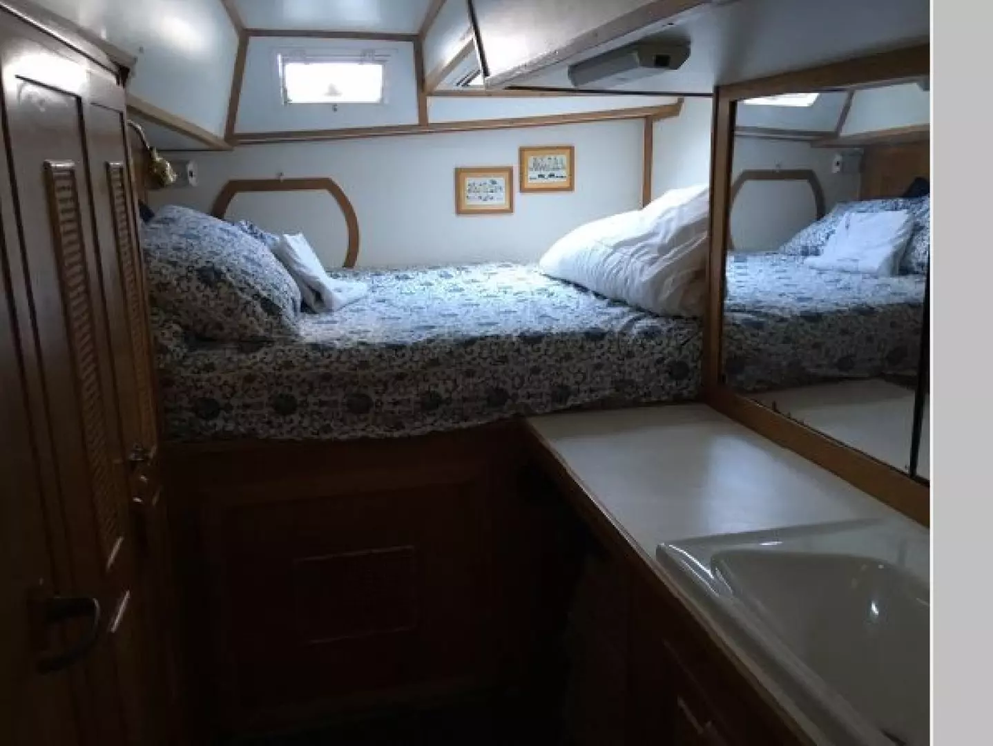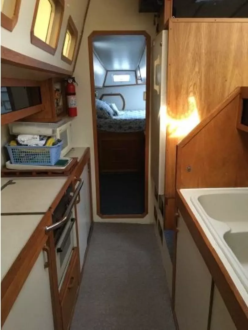 The starboard hull has a large separate galley down. Forward is a single berth with wash basin as well as access to an additional athwartship single berth that is forward of the salon dinette. Aft is a double berth stateroom with 3 opening hatches, fan, reading lights, mirrors, wash basin, closets.