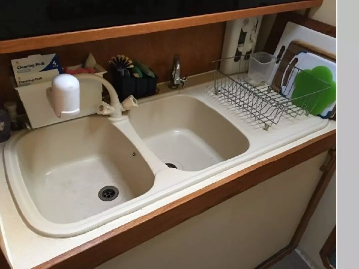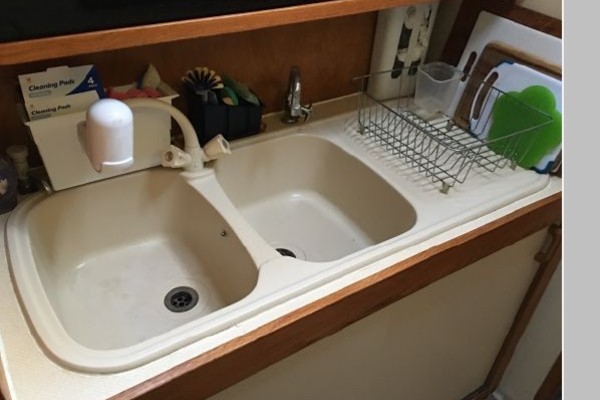- Her galley runs along the starboard hull but is not closed off from the salon. There is plenty of counter and cabinet space for food preparation and storage. Double sinks with hot and cold water