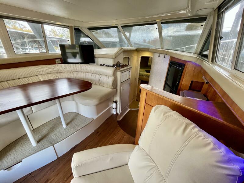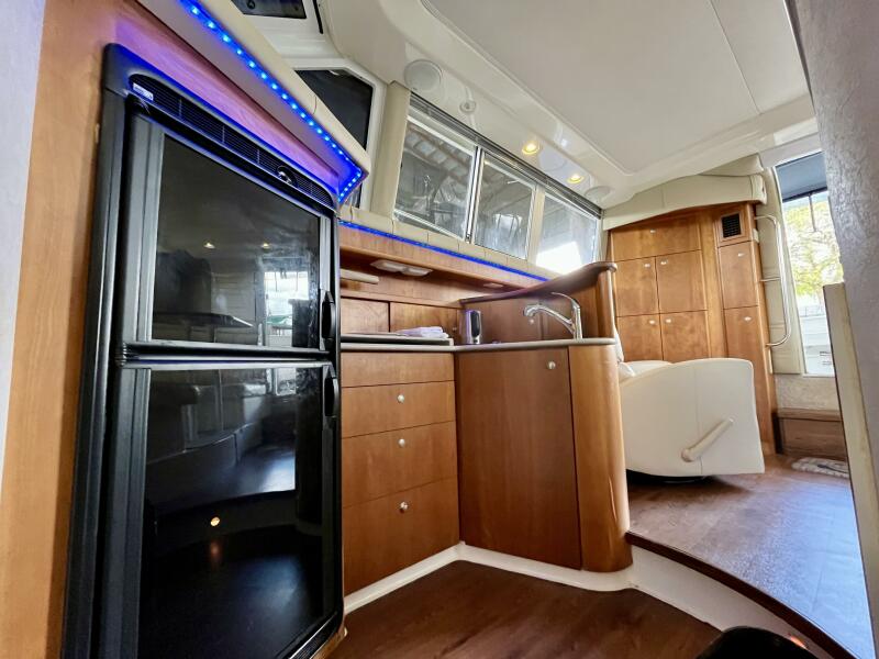 - Spacious Sedan Bridge Layout – Large salon with wraparound windows, two private staterooms, and abundant headroom throughout