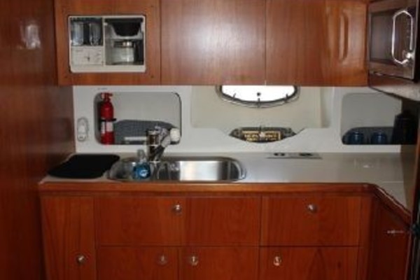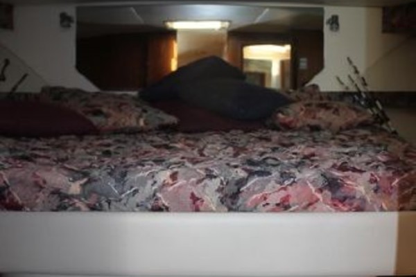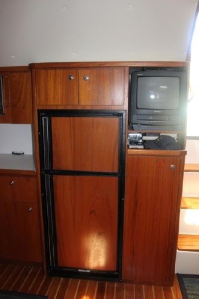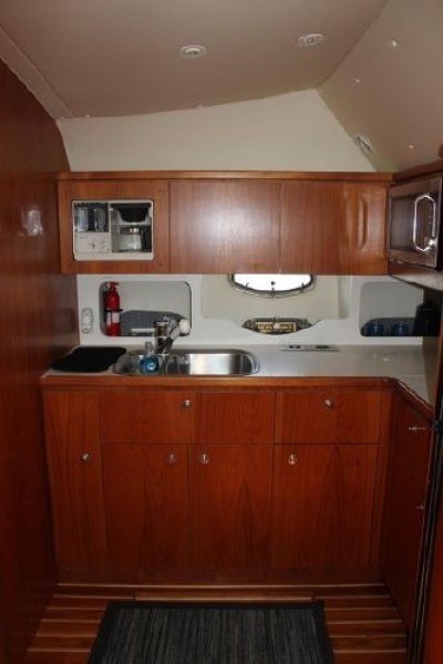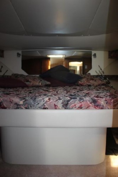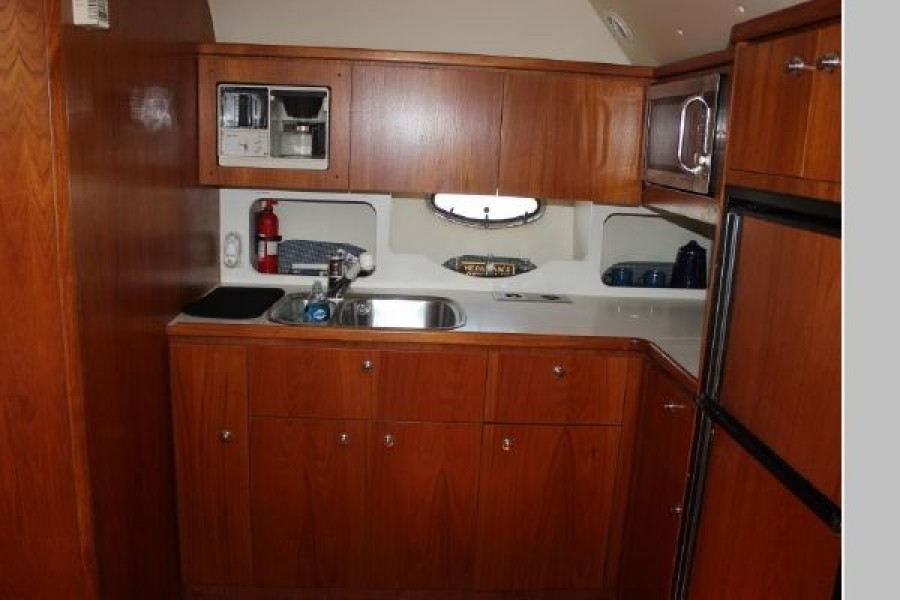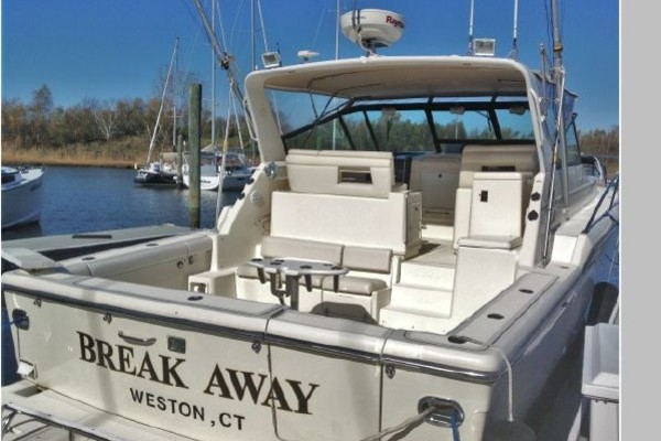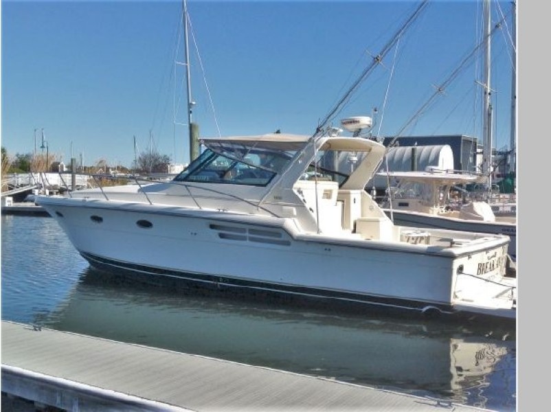 The 4100 Open is built on a beamy modified-V hull with a shallow keel and prop pockets to lower the shaft angles and reduce draft. Under the bridge deck is a full-size engine room with easy access thru cockpit. She has a spacious forward island-berth with plenty of storage and direct access to the head. Her galley has a full size refrigerator/freezer, microwave, 2-burner cook-top, double SS sink and over and under storage. Her spacious salon has a settee/dinette area, entertainment center and the main electrical panel. Her upper cockpit has a double-wide helm seat, L-shaped port lounge and icemaker. Her lower cockpit has all the fishing features you would expect in a Tiara including a tuna door, washdown, lockable rod storage, rod holder table, aft-facing seat and outriggers among others. She has a 9 kW genset and is powered by T 435-HP Caterpillar 3208’s with 1180 hours. Check out the Full Specs and give us a call to see Break Away.