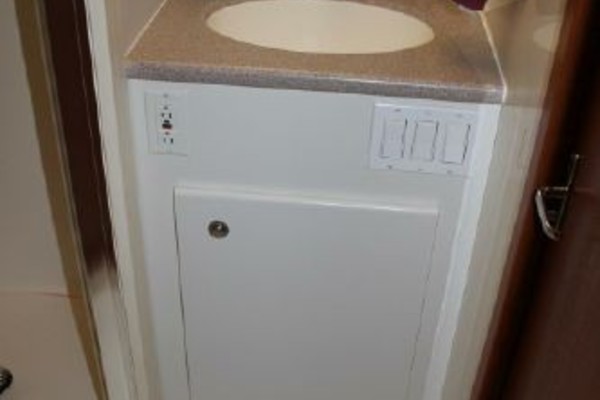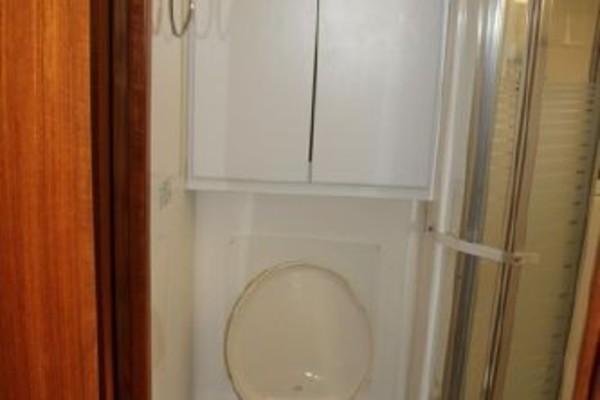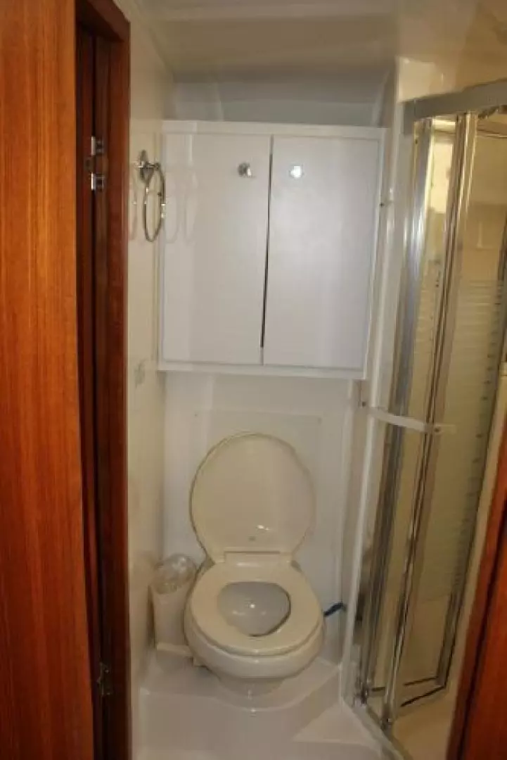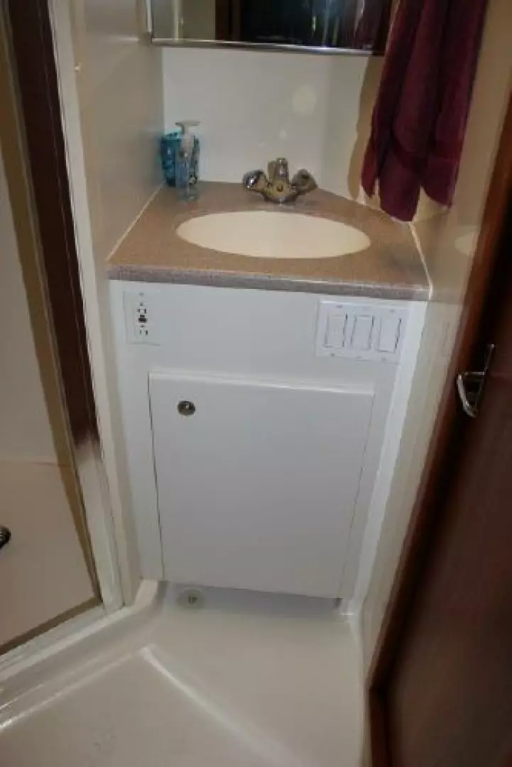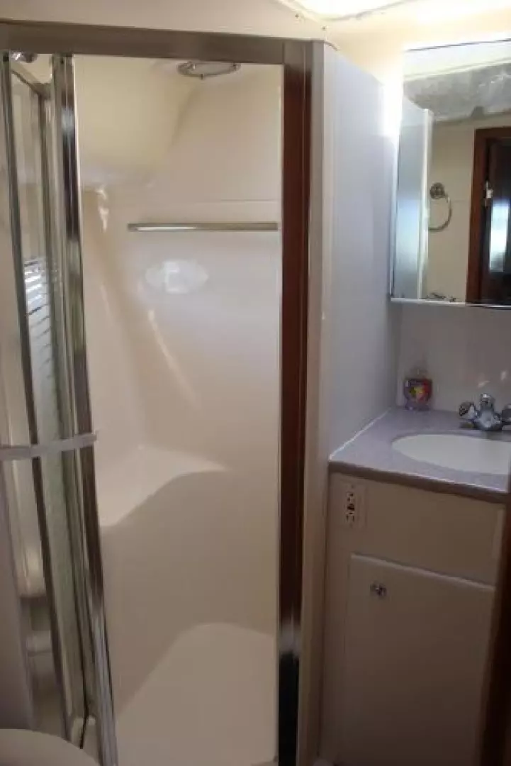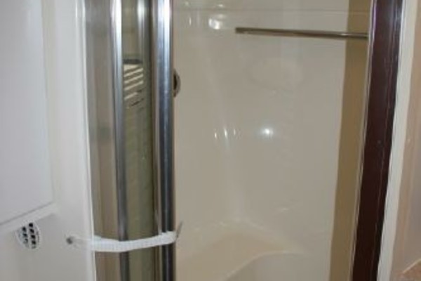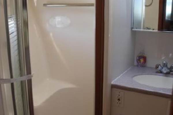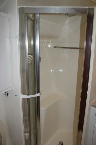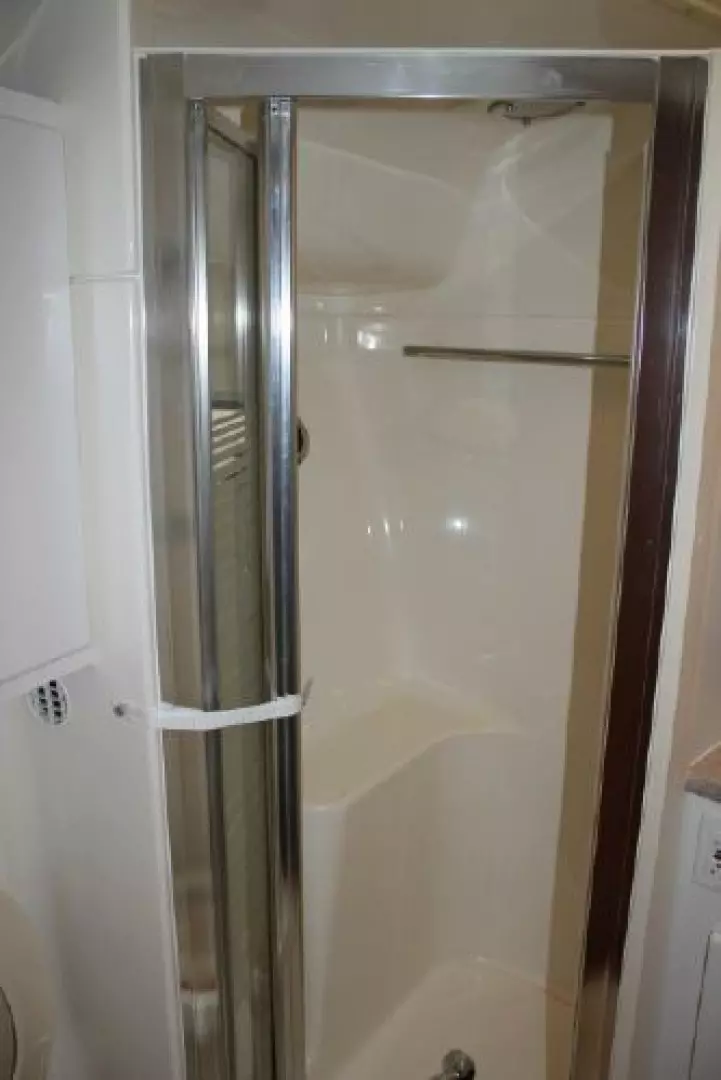 Full fiberglass head with separate shower stall, bi-fold glass shower door, integrated seat, and shower sump pump