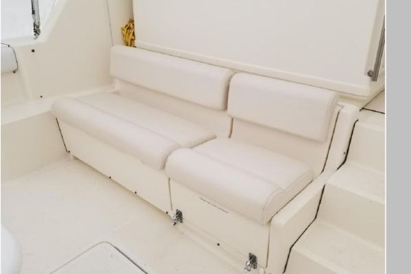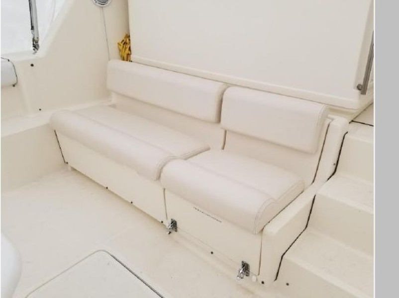 Oversized helm seat forward with wet bar aft, drink holders, and a top loading insulated cooler