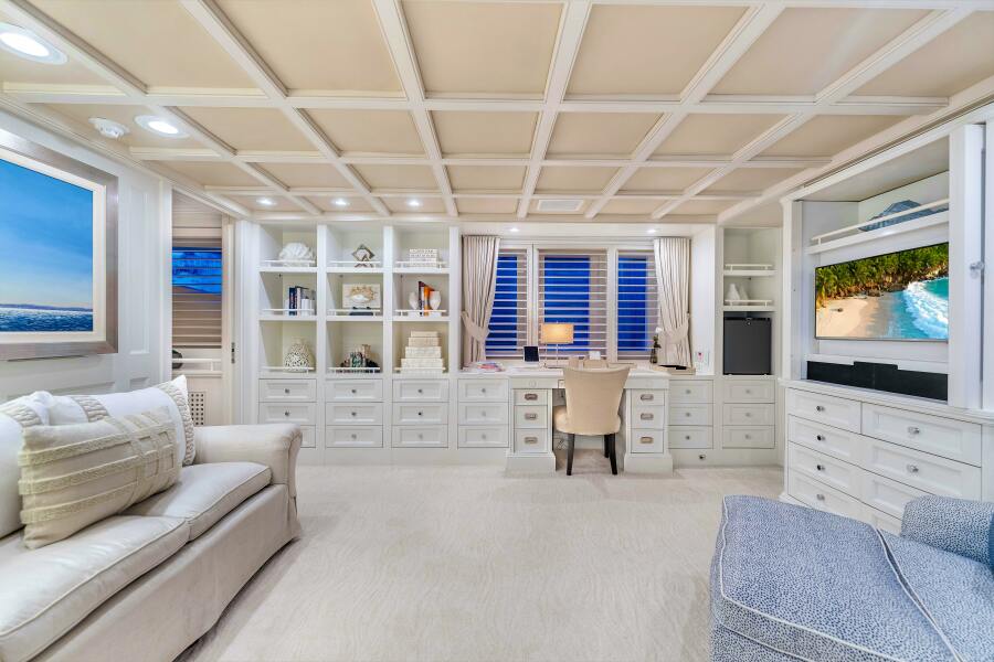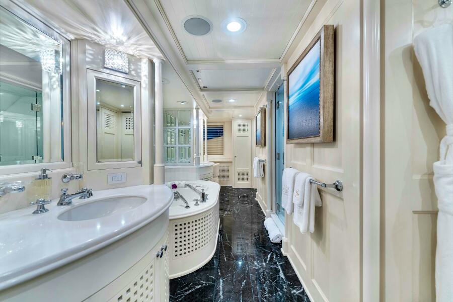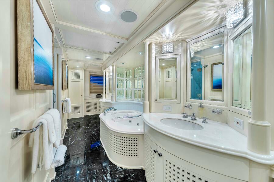 STAR DIAMOND accommodates 10 guests in ultimate comfort across five luxuriously appointed staterooms. The full-beam master stateroom on the main deck offers unparalleled privacy. The owner’s lounge, located on the starboard side, includes seating, an entertainment center, and a desk. The sleeping area on the port side features a plush king-size bed, and the master suite is completed with a luxurious en-suite bath, featuring both a shower and a Jacuzzi tub. The additional guest staterooms provide versatility, with two double-bed staterooms and two convertible twin beds, ensuring ample space for all.