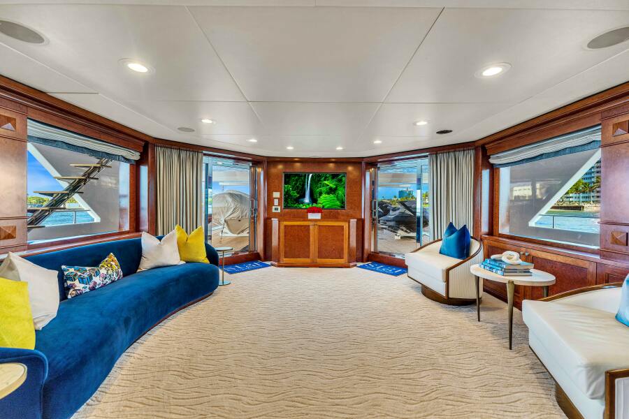 The central staircase leads from the sundeck above or the main deck below, arriving at a foyer area. Further aft on the bridge deck level is the Sky Lounge, which benefits from excellent light, ventilation, and generous space.
