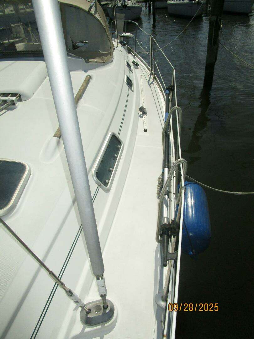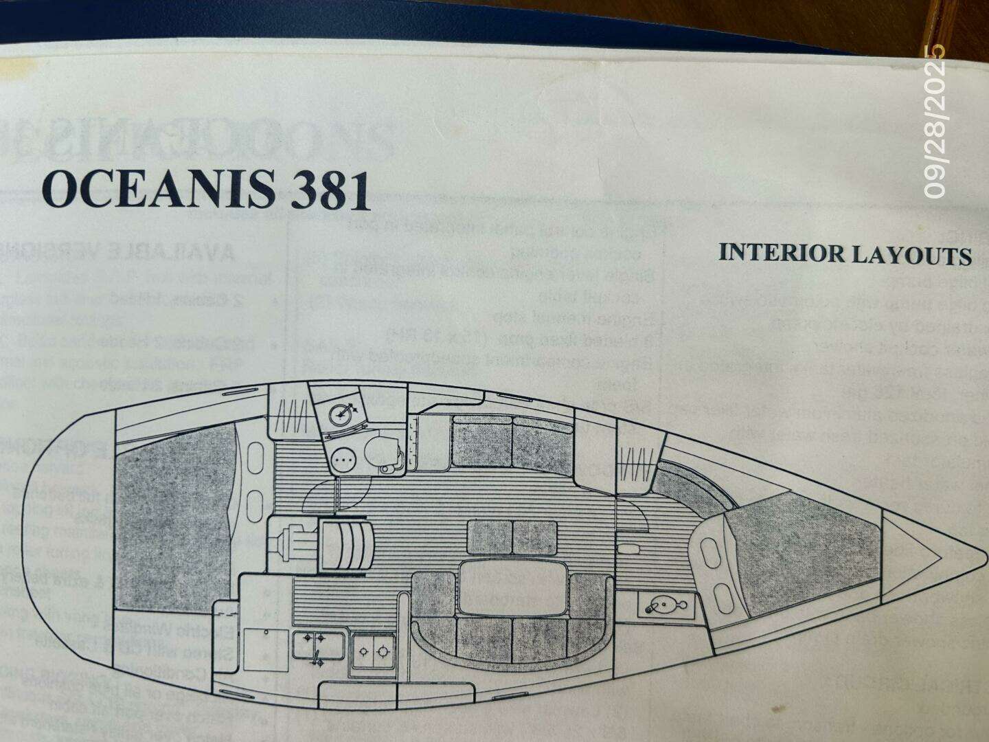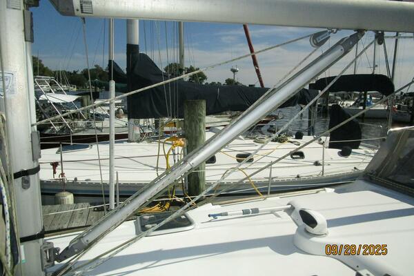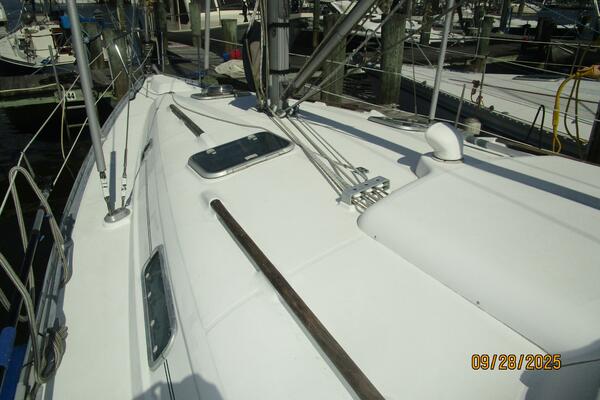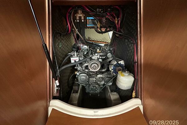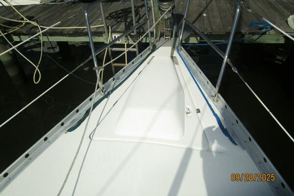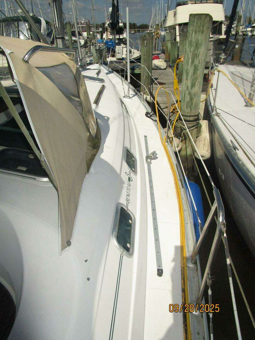 From the sugar-scoop transom, you enter the cockpit via the transom pass-thru and find seating on each side and aft, helm pedestal, bimini and a dodger that needs to be updated. Walk forward and step down the companionway into the salon to find a stateroom with a queen size berth port aft, galley to port, benchseat with storage port forward, head starboard aft, wrap-around settee with a removable double pedestal table starboard forward and a stateroom forward with a queen size berth.