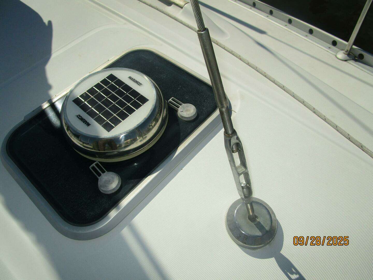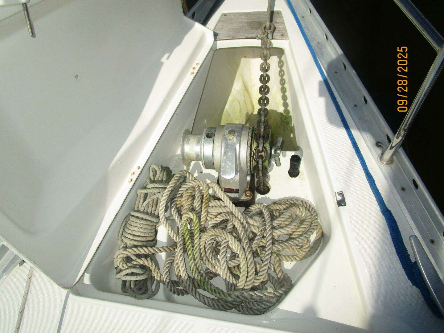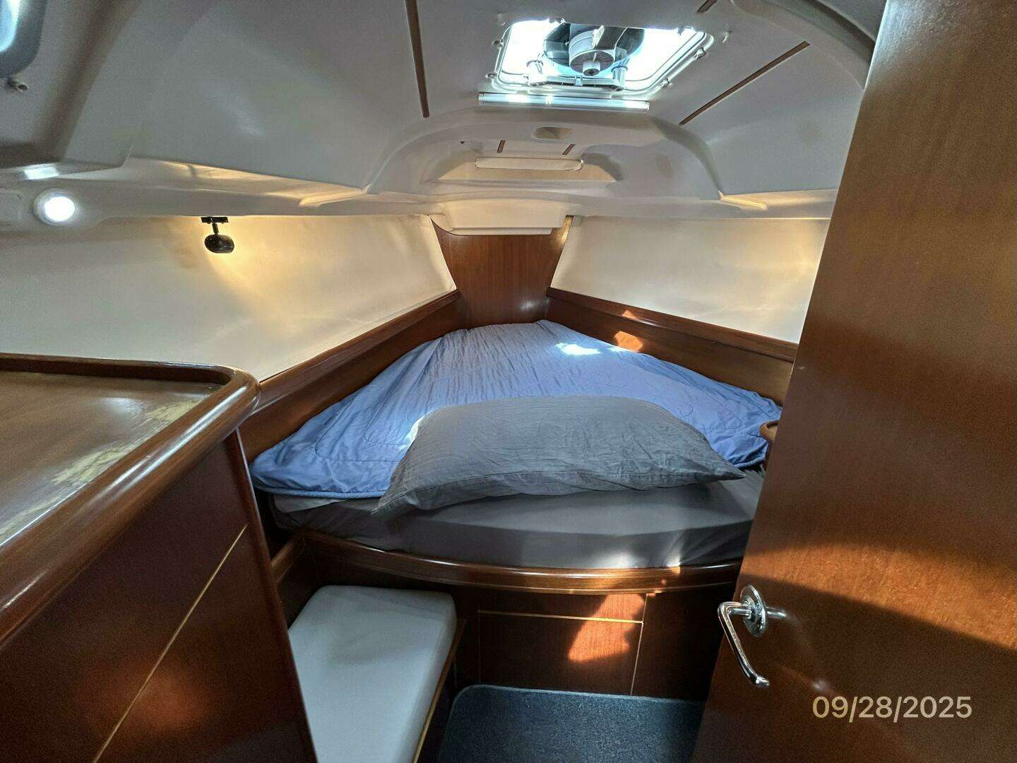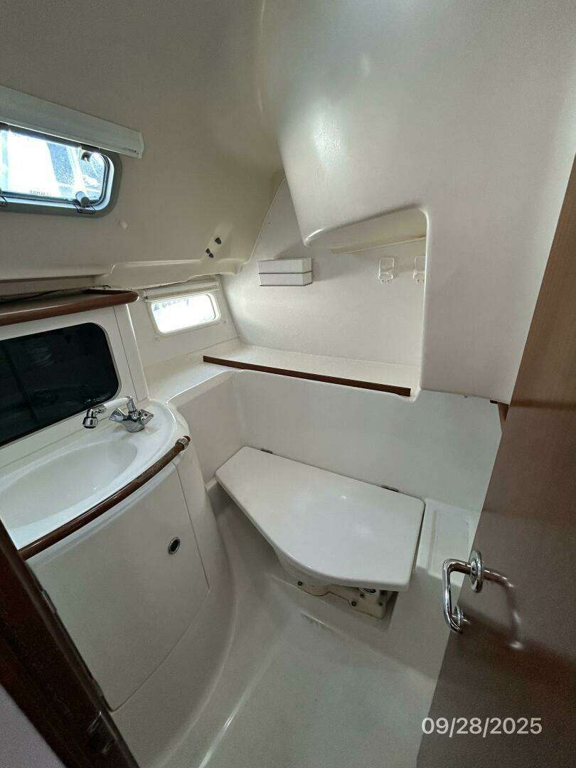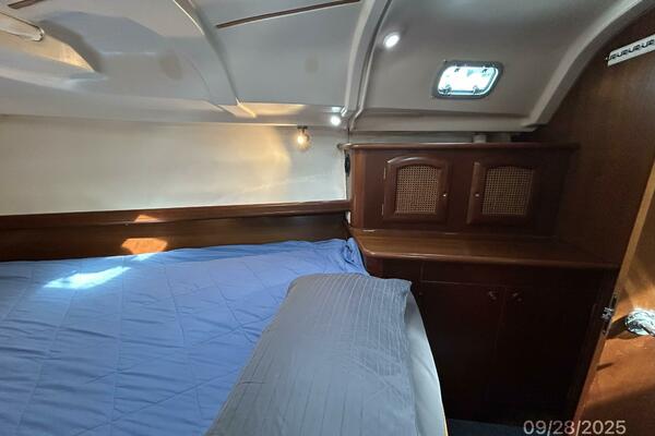 The forward stateroom offers a queen size berth, overhead hatch, 2 portlights, storage cabinets and drawer, hanging locker, reading lights, fan, benchseat to port, bound carpet over wood sole and a sink. The head is starboard aft.