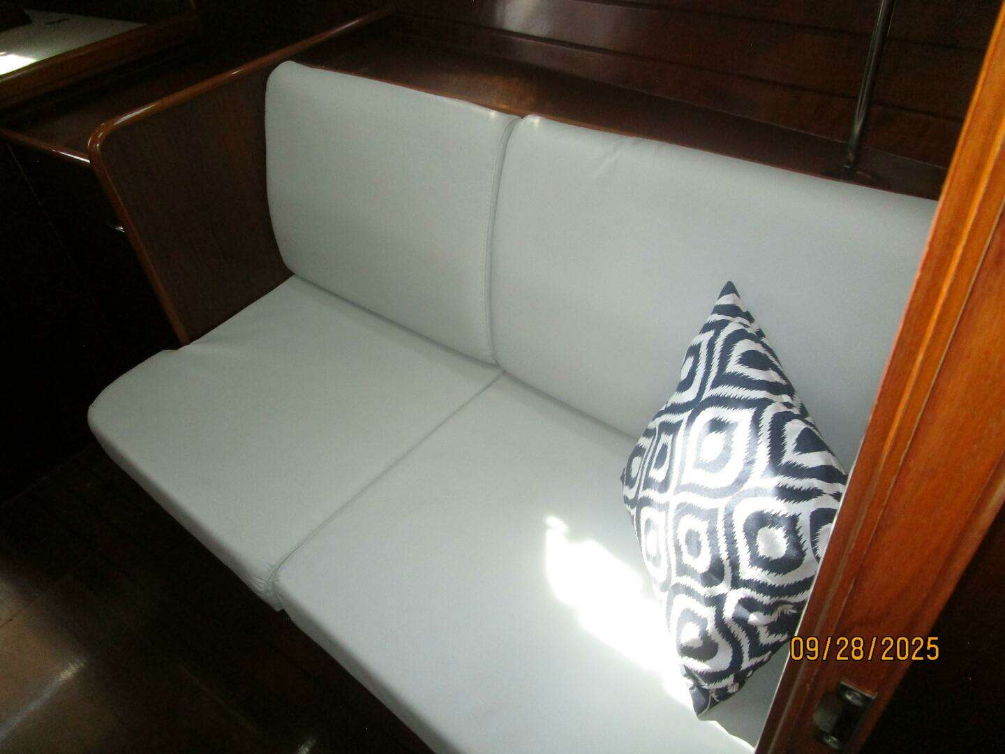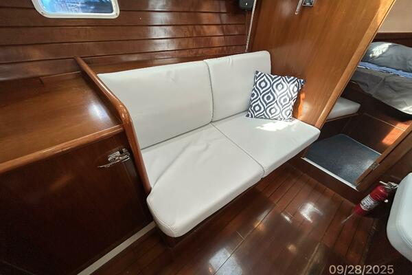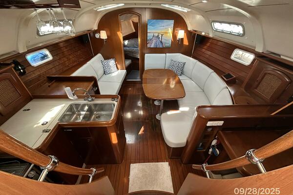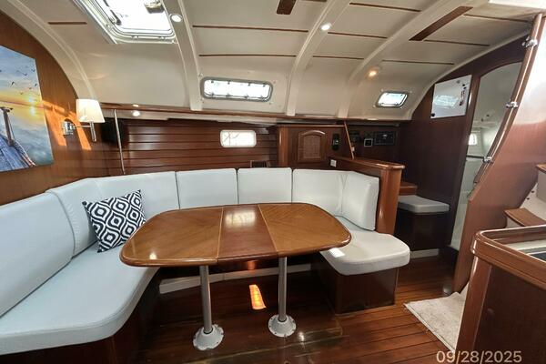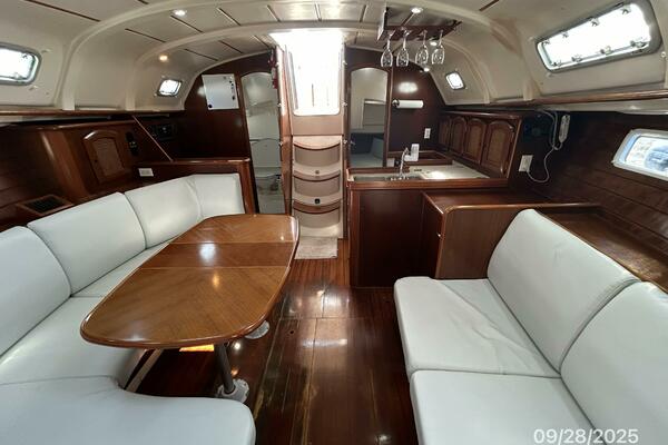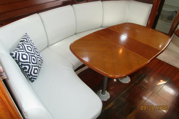 The salon offers a wrap-around settee with storage and a removable double pedestal table starboard forward, benchseat with storage port forward, 2 lower fixed portlights, 4 upper portlights, 2 overhead hatches with SkyShade shades, teak sole and auxiliary access.