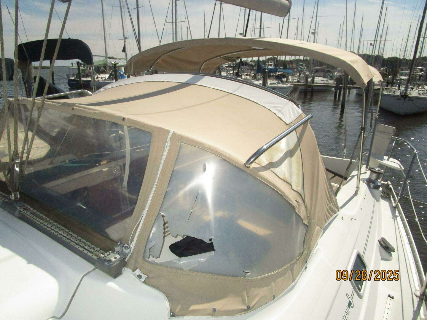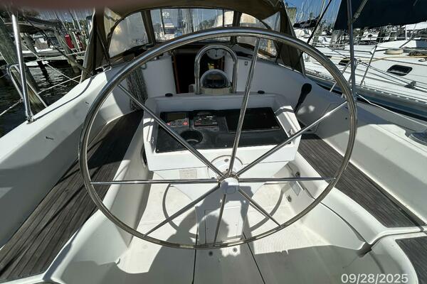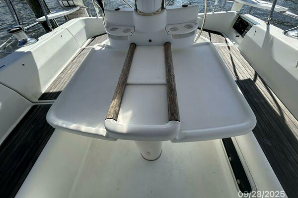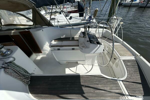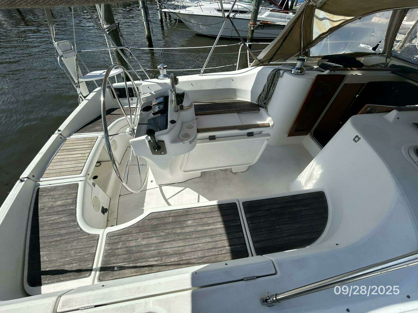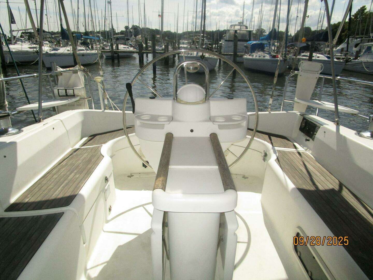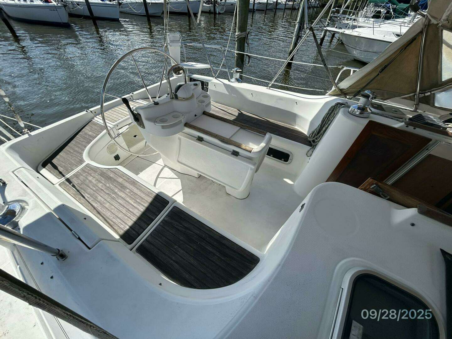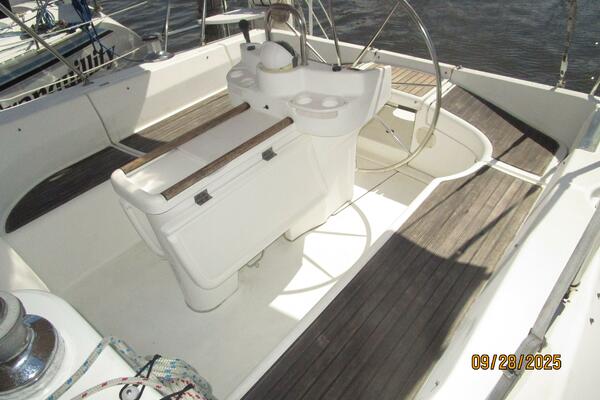 The cockpit offers a non-skid deck, teak covered seating on each side and aft, transom pass-thru, quarter rail seats, fold-up tables, bimini, dodger (Needs repairs or replacement), helm pedestal and electronics as detailed in the electronics section of this presentation.