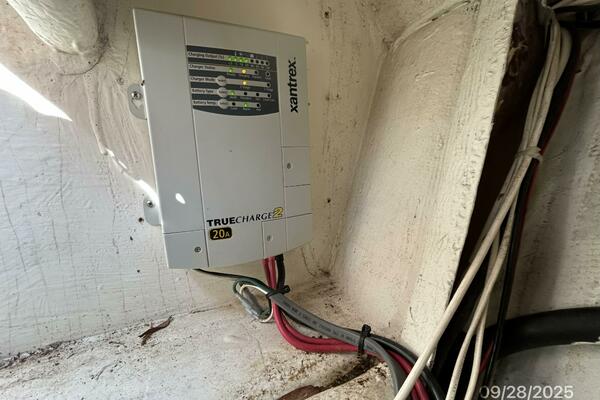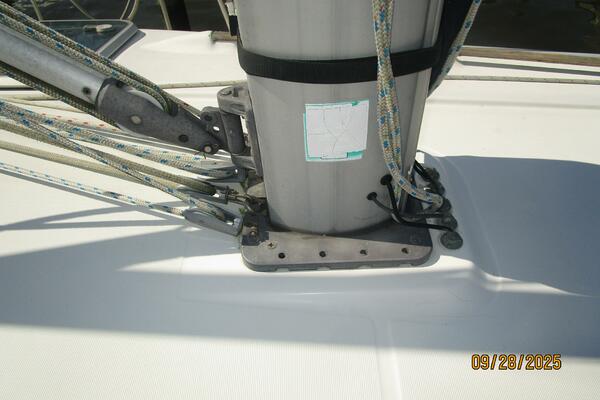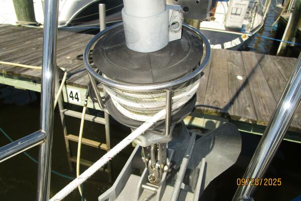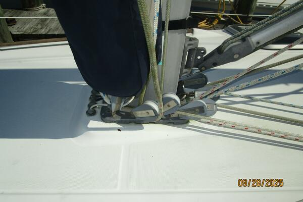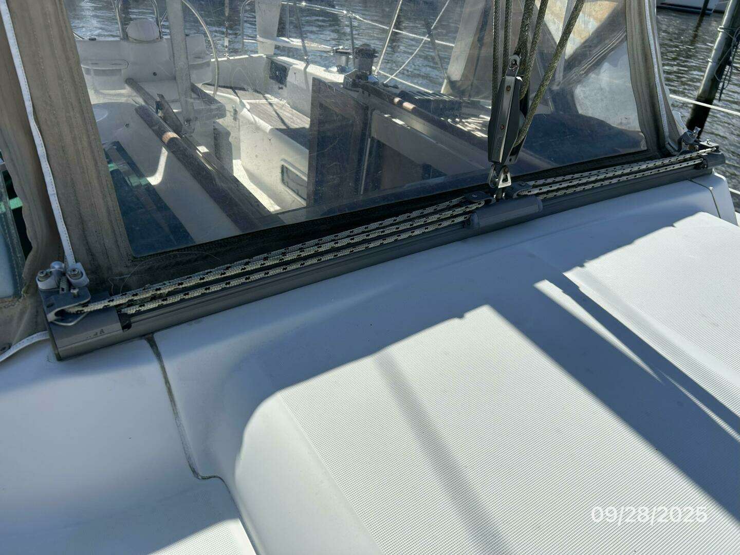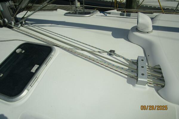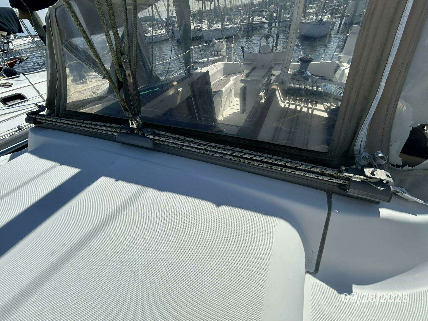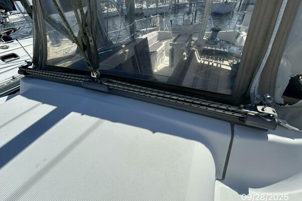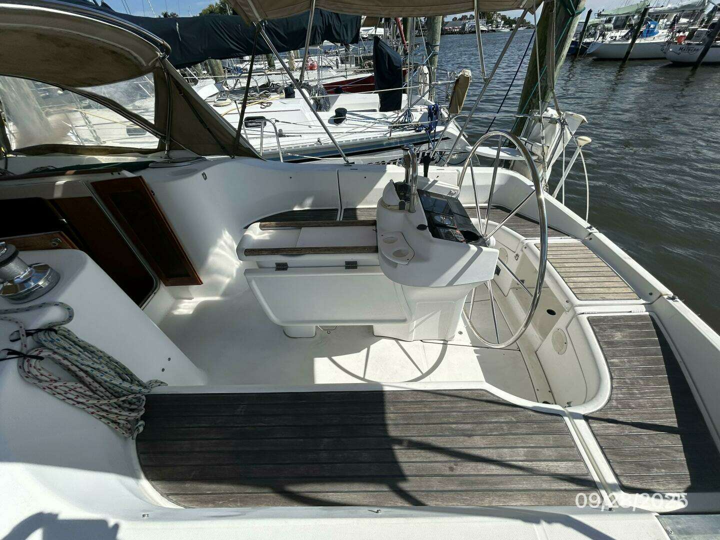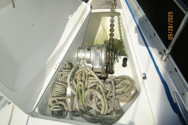 The cockpit offers a non-skid deck, teak covered seating on each side and aft, transom pass-thru, quarter rail seats, fold-up tables, bimini, dodger (Needs repairs or replacement), helm pedestal and electronics as detailed in the electronics section of this presentation.